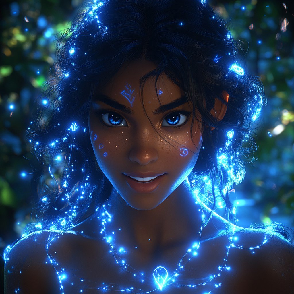 Завораживающая волшебница предстает перед нами в лунном сиянии, окутанная невесомыми шелковистыми одеждами, украшенными таинственными символами, словно ожившими от магии. Ее взгляд искрится колдовским светом, отражая древние знания и скрытые силы. Она стоит посреди тихой поляны, окруженной шепчущими деревьями, создавая атмосферу загадочности и умиротворения. Легкая улыбка играет на ее губах, намекая на глубокую мудрость и контроль над мощными энергиями. Эта девушка – воплощение эфирной красоты и таинственного очарования, способная повелевать стихиями и раскрывать секреты мироздания. Изображение пронизано атмосферой волшебства и сказки, где каждая деталь призвана подчеркнуть ее связь с потусторонним миром. Она словно сошла со страниц древних легенд, чтобы подарить зрителю мгновение восторга и веры в чудо. Ее образ – это гармония силы и нежности, загадки и красоты, магии и мудрости. Это визуальная поэма о волшебстве, заключенная в облик прекрасной девушки