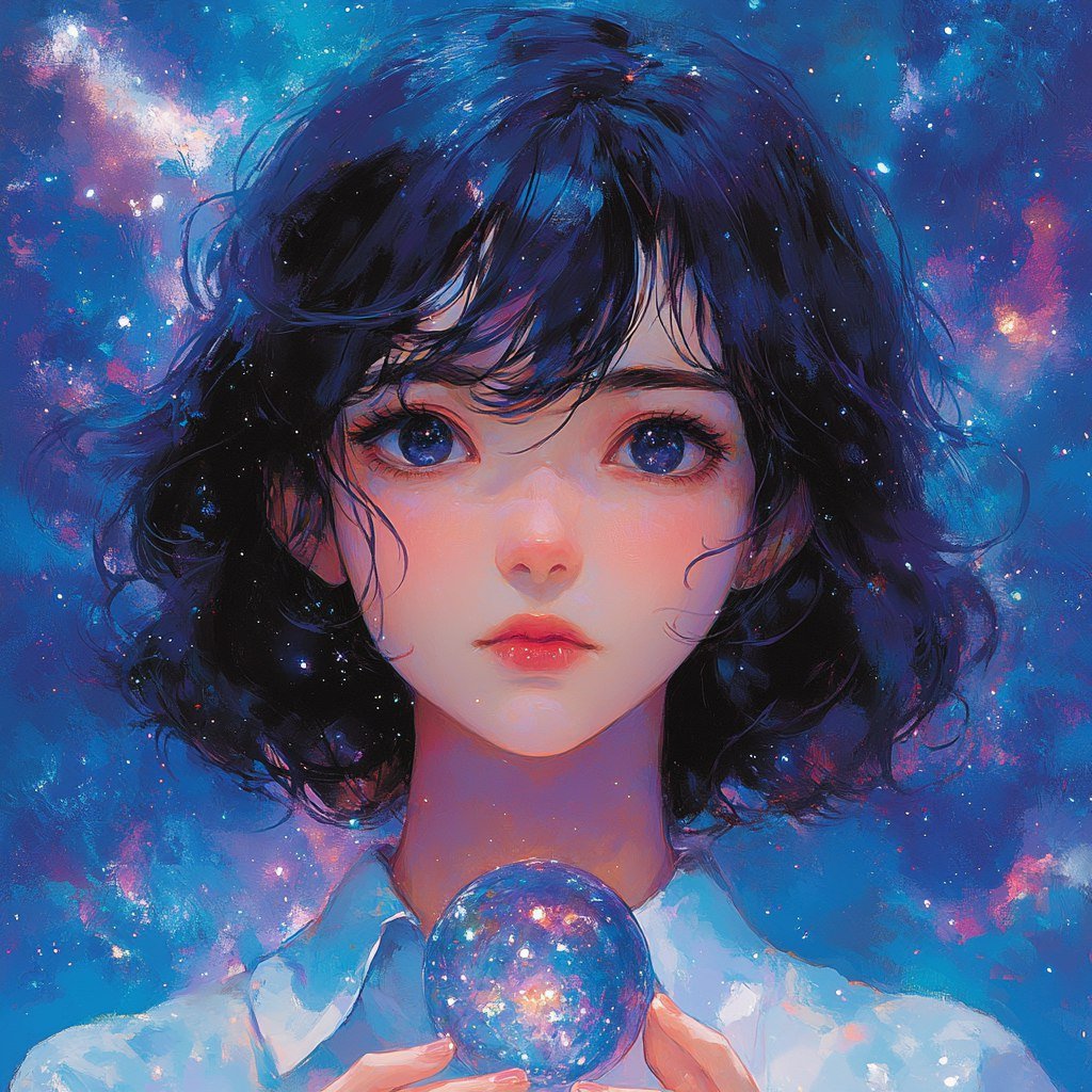 Взгляд девушки выражает спокойствие и мечтательность, а глаза полны мудрости, словно она знает тайны вселенной. Она нежно держит в руках светящийся шар энергии – символ силы и загадочности. В целом, изображение воплощает гармонию между человеком и космосом, сочетая красоту, хрупкость и мощь, создавая ощущение полета в невесомости среди бескрайних просторов вселенной.