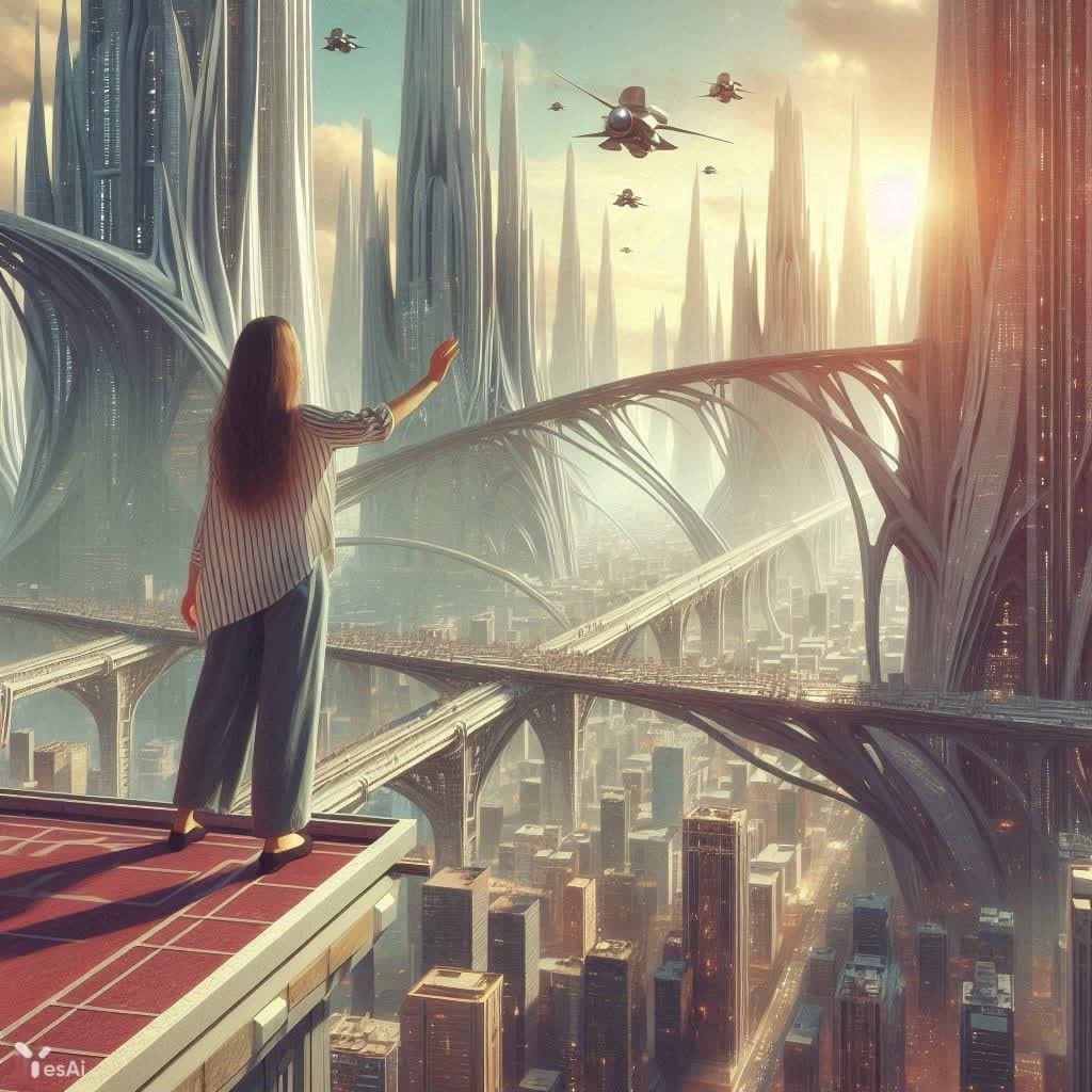 Завораживающий вид футуристического мегаполиса открывается глазам молодой женщины, застывшей на краю небоскреба причудливой архитектуры. Её спокойная поза и задумчивый взгляд контрастируют с динамичной панорамой, простирающейся до самого горизонта. Огромный город, словно выросший из фантазии художника, поражает воображение своими исполинскими зданиями, напоминающими переплетенные кристаллы и причудливые геометрические фигуры. Сложная сеть мостов-виадуков соединяет небоскребы друг с другом, создавая ощущение непрерывного движения и связи. В воздухе царит оживленное движение летающих машин, подчеркивающее технологический прогресс этой внеземной цивилизации. Картина вызывает чувство восторга и одновременно легкой тревоги перед неизведанным. Это встреча двух миров – земного и инопланетного, созерцание красоты и мощи чужой культуры, заставляющее задуматься о месте человека во Вселенной. Панорама захватывает дух своей масштабностью и детализацией, обещая невероятные приключения в этом удивительном мире будущего. Небоскребы устремляются вверх, словно стремясь к звездам, а девушка на краю площадки кажется маленькой точкой перед лицом этого грандиозного великолепия