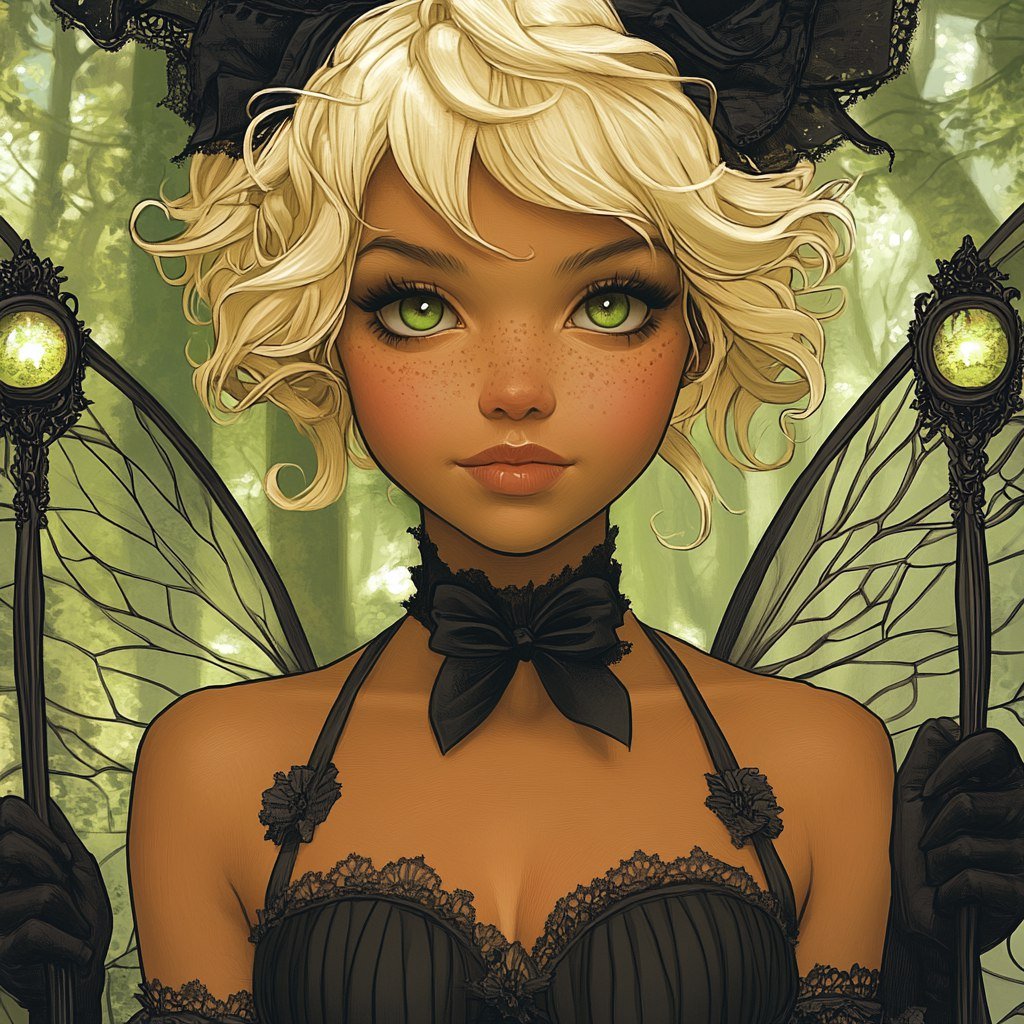 Очаровательная озорная фея с нежно-лиловыми крыльями предстает в изысканном темно-розовом платье, украшенном кружевными деталями. В её руках сияет волшебная палочка, излучая магическое свечение. Яркие изумрудные глаза и лучезарная улыбка выдают её безграничную радость и игривый нрав. За феей простирается сказочный лес, залитый теплыми красками заката – золотистым, оранжевым и багряным. Иллюстрация выполнена в стиле мультфильма, вдохновленного волшебными карточными играми, что придает ей особую атмосферу фантазии и приключения. Каждая деталь продумана до мелочей, от тончайших кружев на платье до мерцающего света палочки и переливов цветов в кронах деревьев. Это не просто изображение, а портал в мир волшебства, полный тайн и чудес. Фея словно приглашает зрителя отправиться вместе с ней в захватывающее путешествие по заколдованному лесу, где оживают сказки и исполняются самые заветные мечты. Её образ воплощает собой легкость, грацию и безграничную энергию, а окружающий пейзаж создает ощущение тепла и уюта. Эта картина – настоящий праздник для глаз, наполненный позитивом и вдохновением, идеально подходящий для тех, кто верит в чудеса и ценит красоту волшебного мира