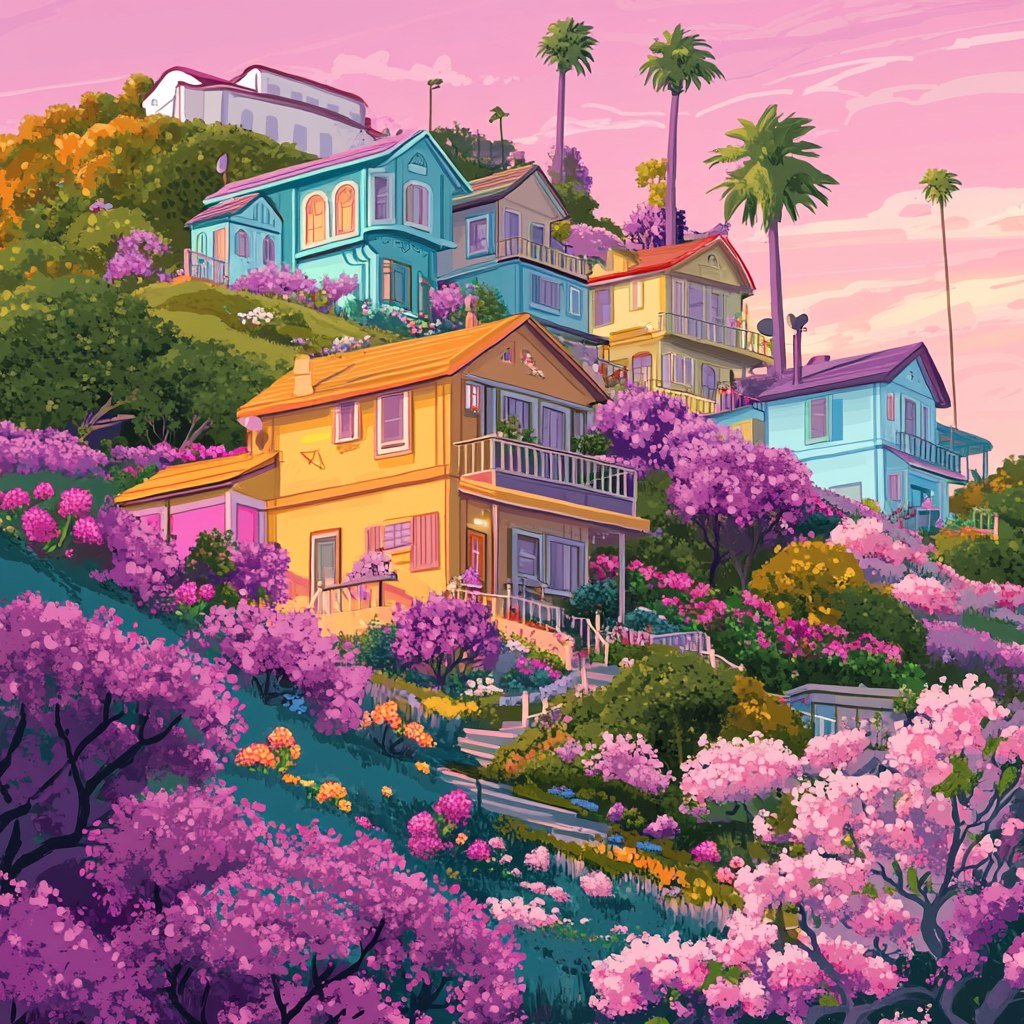 Очарование наивного искусства: сказочные домики на холме в цветах - Пример изображения, созданного ИИ Миджорни