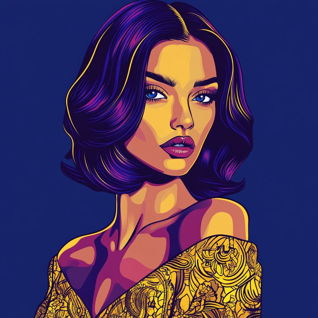Изысканный цифровой портрет современной женщины, воплощающей уверенность и стиль. Её тёмные волосы, аккуратно уложенные прямыми прядями, обрамляют лицо с выразительными чертами. Яркий макияж в сочетании насыщенного кобальтового синего и пурпурного оттенков подчеркивает её индивидуальность и добавляет образу дерзости и гламура. Она одета в облегающее золотое платье, украшенное сложным узором, которое придает портрету роскоши и изысканности. Глубокий синий фон создает атмосферу элегантности и утонченности, усиливая общее впечатление от работы. Эта картина - ода женственности, силы и безупречного вкуса. В каждом пикселе чувствуется внимание к деталям и стремление передать неповторимый характер модели. Портрет излучает энергию и магнетизм, приковывая взгляд и вызывая восхищение. Он словно запечатлел момент уверенности и внутренней гармонии. Использование ярких цветов и контрастных сочетаний делает изображение динамичным и запоминающимся, а тщательно продуманная композиция создает ощущение завершенности и совершенства. Это не просто портрет, это манифест современной красоты и женской силы