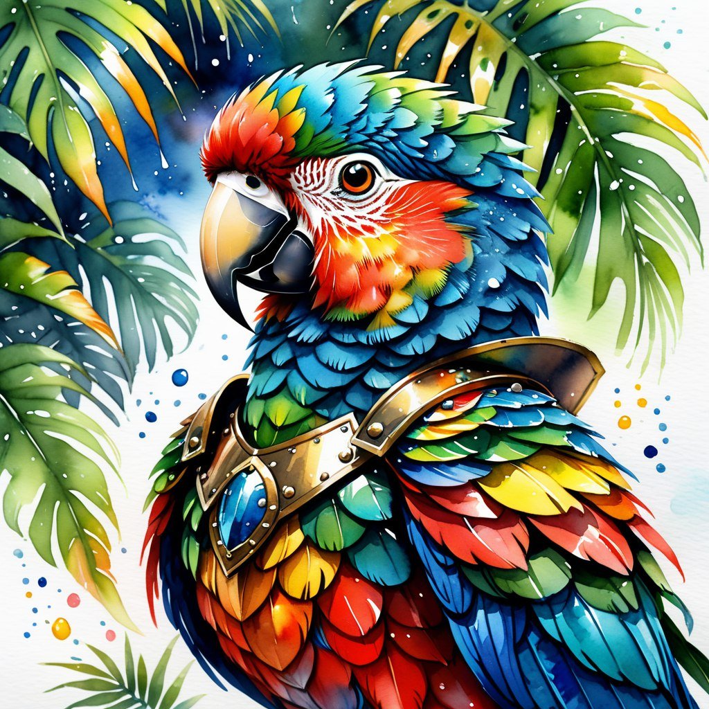 Завораживающий образ очаровательного попугая, облаченного в доспехи, рожденный воображением художника. Это произведение выполнено в технике мокрой акварели, создающей ощущение влажности и глубины. Впечатляющая детализация корабля гармонично сочетается с буйством тропической природы – густыми джунглями, таинственной флорой и экзотическими растениями Sfuatoma. Атмосфера наполнена мистическим блеском и легкой мрачностью, что подчеркивается гротескными элементами в изображении ботаники. Вдали виднеется побережье океана, окутанное надвигающейся грозой, добавляя драматизма и напряжения в общую картину. Картина словно переносит зрителя в мир фантазий, где животные обретают человеческие черты, а природа подчиняется воле творца. Это не просто изображение попугая – это захватывающая история, рассказанная языком цвета и света, наполненная символизмом и скрытыми смыслами. Изображение сочетает в себе элементы реализма и сюрреализма, создавая неповторимую атмосферу сказки и волшебства. Насыщенные оттенки акварели подчеркивают текстуру доспехов и перьев, а детализированное изображение корабля придает композиции ощущение масштаба и монументальности. Картина вызывает чувство удивления и восхищения перед красотой и загадочностью окружающего мира, побуждая зрителя задуматься о границах реальности и воображения