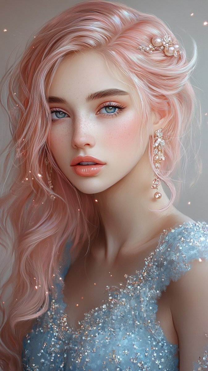 digital artwork of a young woman with cascading pastel pink hair, a light blue dress adorned with sparkling sequins, her expression is serene and thoughtful, sporting delicate pearl earrings and a soft peach lipstick, the bg is a light cream color with subtle textures, creating a calm and ethereal mood.