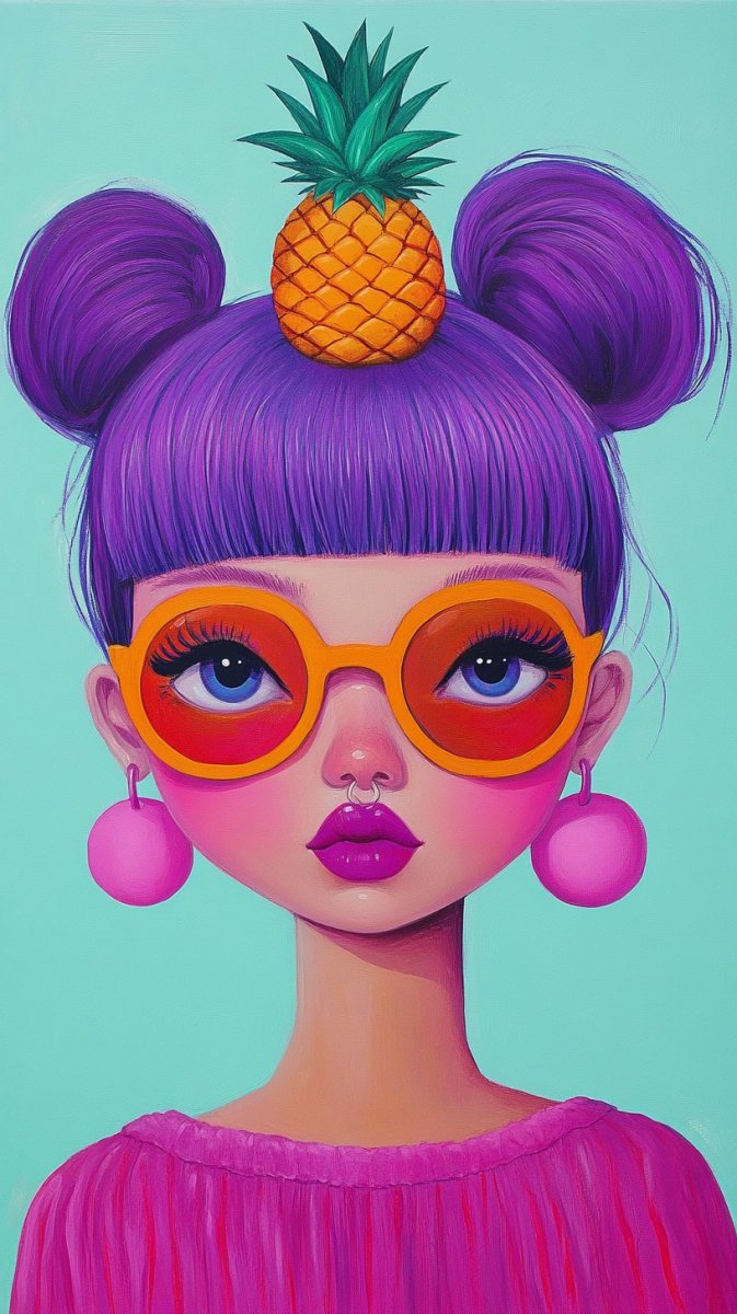 illustration of a doll with bright purple hair styled in a playful bob, a quirky pineapple-shaped accessory on top, face painted with an array of vibrant colors, wearing oversized round sunglasses and bold pink earrings, the background is a light mint hue making the doll pop, overall atmosphere is fun and artistic.
