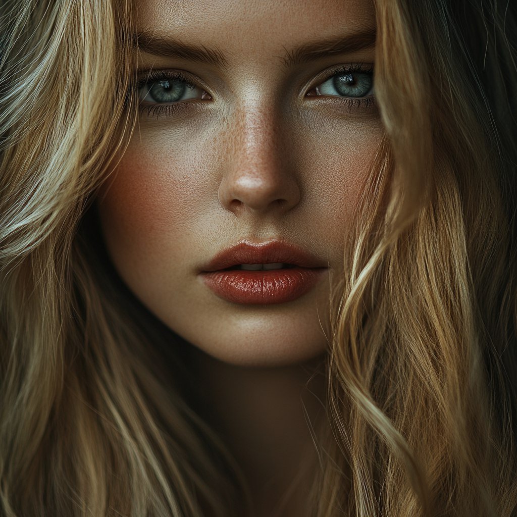 Загадочный взгляд молодой женщины с длинными светлыми волосами и алой помадой - Изображение, созданное нейросетью Midjourney