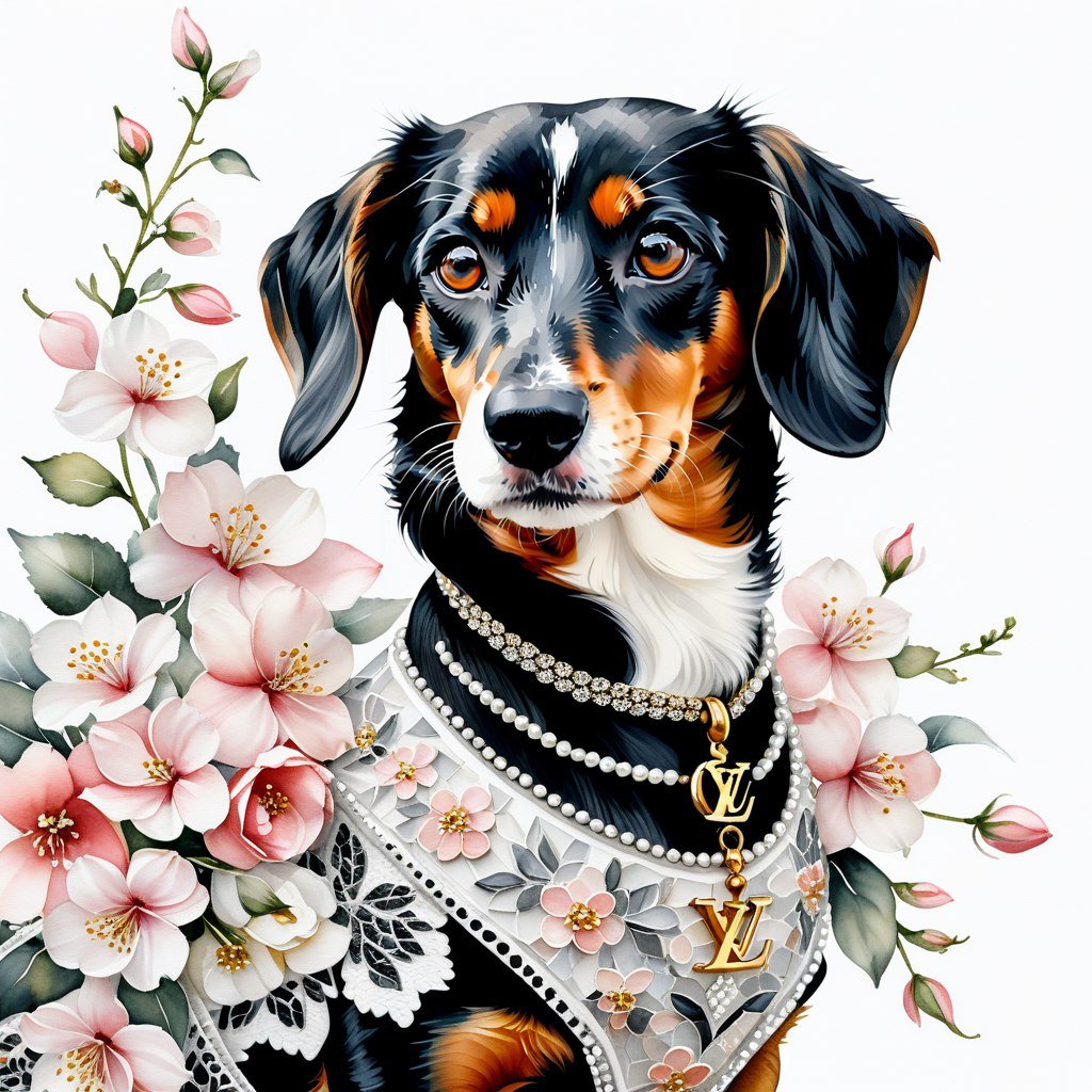 delicat watercolor,white background, Beautiful Dashund portrait in a with creme flowers wedding laces dress, style Louis Vuitton ,France