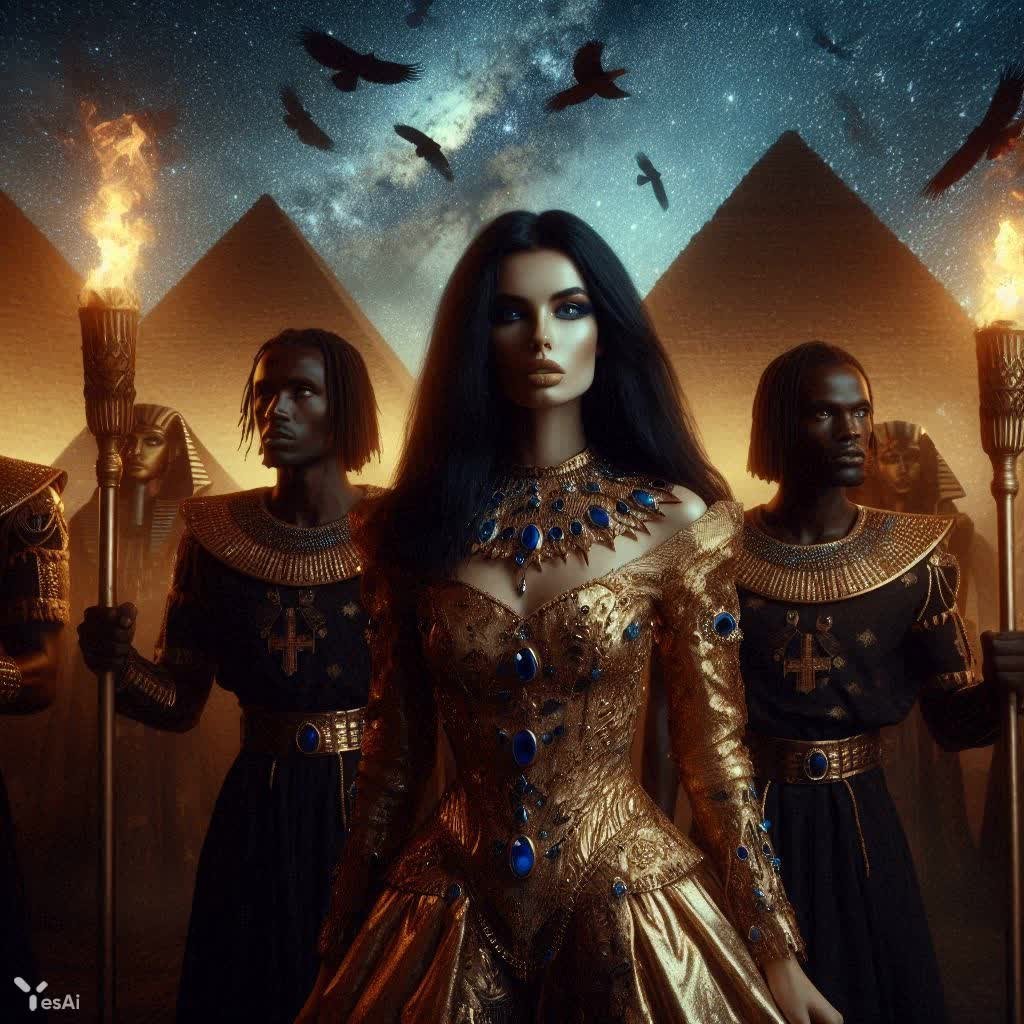 Завораживающий взгляд загадочной женщины в золотом платье, украшенном сапфирами, переносит нас в сердце древнего Египта. Её светлая кожа и короткие черные волосы контрастируют с роскошью наряда, а пристальный взгляд, полный тайны, приковывает внимание зрителя. Вокруг неё – трое стражников в черных килтах, вооруженных копьями и факелами, их фигуры словно вырезанные из ночи. Вдали величественно возвышаются пирамиды, устремляясь к безбрежному звездному небу. Вся сцена пронизана яркими золотыми, синими и черными тонами, создавая атмосферу мистической сказки и величия древней цивилизации. Крупный план позволяет рассмотреть мельчайшие детали – от сверкания сапфиров в платье до выражения лица женщины, хранящей свои секреты. Кажется, что время остановилось, погружая нас в мир магии, тайн и несбывшихся надежд. Это не просто изображение, а портал в забытое царство фараонов, где реальность переплетается с фантазией, а прошлое оживает перед нашими глазами. Чувствуется мощь древней культуры, её величие и загадочность, которые продолжают волновать умы людей на протяжении тысячелетий. Этот момент запечатлен навсегда, словно кадр из волшебного фильма, рассказывающего историю о любви, предательстве и поисках истины в мире богов и смертных