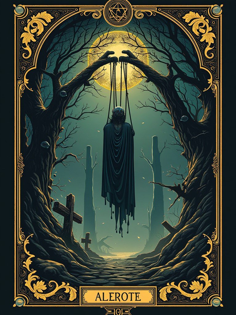 Загадочный повисший человек: мистическая иллюстрация таро в готическом стиле - Пример изображения из нейросети Flux