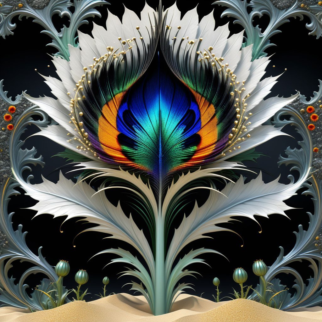 Завораживающее переплетение квантовой реальности и темной фантазии, где мироздание предстает в виде сложной многогранной конструкции. Это визуальная поэма о вечной архитектуре, вдохновленной природными формами – колючим чертополохом, роскошным павлином, нежным анемоном и экзотической ланиции. В основе лежит логистическая прогрессия, воплощенная в пространственной геометрии стихий: водной глади, зыбкого песка и разрушительного урагана. Творчество пронизано психотрансреализмом и нео-функциональностью, создавая ощущение погружения в мрачную ботанику, где космическая геометрия переплетается с иллюзорным отражением нирваны – ложной голограммой покоя. Эстетика проявляется в деталях: резные узоры на коже, нежная палитра оттенков мятно-серого, алого, черного и бежево-кремового. Использование материалов создает ощущение текучести жидкого стекла, переплетающегося с золотыми нитями, серебром, углеродом, маслом. Эта работа представляет собой погружение в многомерное пространство 5D с невероятно высоким уровнем детализации – 1024K пикселей, обеспечивающим максимальную реалистичность и захватывающий визуальный опыт. Это не просто изображение, а портал в альтернативную реальность, сотканную из света и тени, красоты и загадки, где границы между физическим и духовным миром стираются. В этой работе каждый элемент тщательно продуман и играет свою роль в создании неповторимой атмосферы тайны и величия