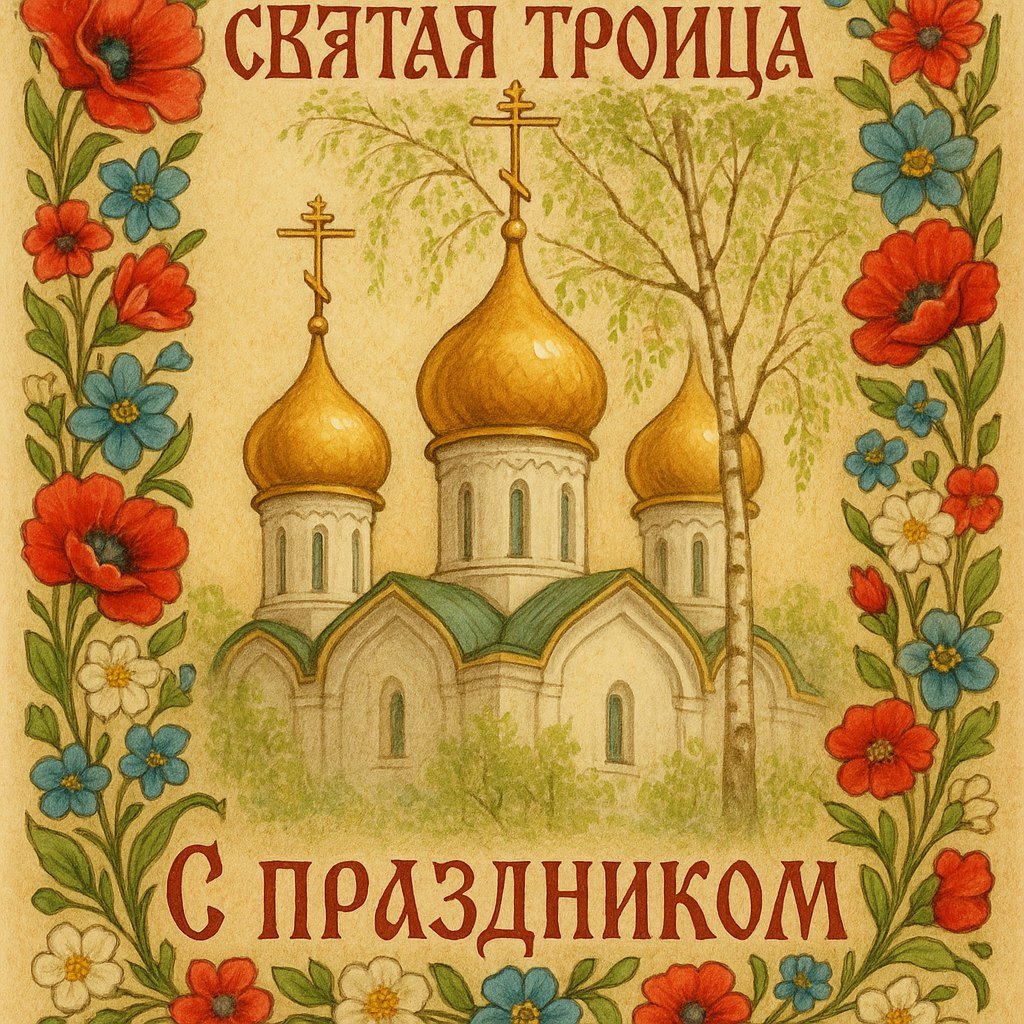 Изысканная и торжественная открытка, пронизанная духом русской традиции и духовности. В центре композиции возвышаются сияющие золотые купола храма, символизирующие веру и небесную благодать. Рядом с ними – изящная березка с легкой, трепетной листвой, воплощающая красоту природы и чистоту души. Изображение живописно обрамлено буйным венком из ярких цветов, создающих атмосферу радости и праздника. Особый шарм открытке придает надпись Святая Троица, выполненная в элегантном старославянском стиле, которая подчеркивает значимость события и добавляет ей аутентичности. Эта открытка станет прекрасным способом выразить искренние поздравления с одним из самых светлых и почитаемых праздников православия – Днем Святой Троицы. Она не только порадует глаз своим художественным исполнением, но и передаст теплоту и уважение к традициям русской культуры. Идеальный выбор для тех, кто ценит духовные ценности и желает поделиться радостью этого особенного дня с близкими людьми. Открытка станет памятным знаком внимания и добрых пожеланий