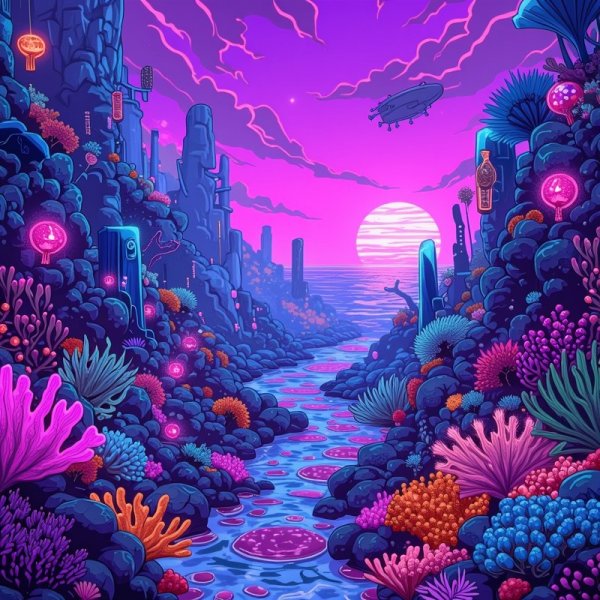 Захватывающее зрелище инопланетного рынка будущего – это калейдоскоп красок и технологий, разворачивающийся на фоне причудливого черно-белого шахматного мощения. Яркие торговые палатки манят своим экзотическим ассортиментом, а серебристые роботизированные продавцы демонстрируют свои товары с безупречной точностью. Возвышающиеся над площадью изысканные скульптуры добавляют атмосферу загадочности и величия. Все окутано завораживающим фиолетовым туманом, который создает ощущение нереальности происходящего. Вдали, под сюрреалистичным закатом, мерцают таинственные светящиеся сферы, намекая на далекие миры и неизведанные возможности. Это место – перекресток галактик, где встречаются разные расы и культуры, предлагая уникальные товары и услуги в атмосфере футуристического великолепия. Представьте себе ароматы незнакомых специй, звуки странных мелодий и ощущение приключения, которое пронизывает каждый уголок этого необычного места. Это не просто рынок – это портал в мир фантазий, где реальность переплетается с мечтой, а границы возможного стираются. Окунитесь в эту атмосферу чуда и откройте для себя бесчисленные сокровища, спрятанные среди сверкающих огней и таинственных теней этого удивительного инопланетного базара. Здесь каждый найдет что-то особенное для себя, будь то редкий артефакт или просто незабываемые впечатления от посещения места, где прошлое, настоящее и будущее сливаются воедино