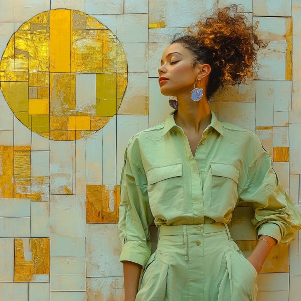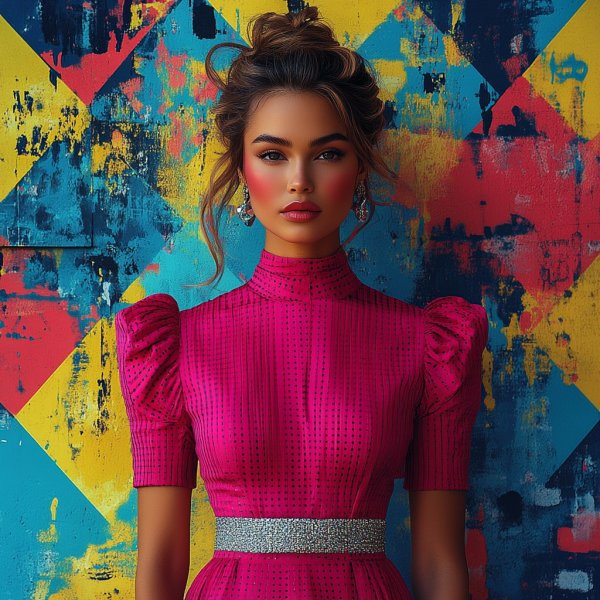 Элегантная женщина в изумрудно-зеленой юбке из малахита и кремовой блузке становится центром внимания на фоне захватывающего вихря ярких цветов и черных точек. Изображение, выполненное в фотореалистичном стиле, демонстрирует гармоничное сочетание высокой моды и уличного искусства, создавая ощущение динамики и энергии. Яркие оттенки и смелые контрасты отсылают к эстетике поп-культуры, добавляя изображению современности и живости. Детализированная текстура юбки из малахита притягивает взгляд, а спокойный тон блузки создает приятный баланс с насыщенностью фона. Общий визуальный эффект – это мощное сочетание стиля, цвета и движения, передающее ощущение захватывающей энергии и современного вкуса. Кажется, будто персонаж буквально растворяется в этом буйстве красок, становясь неотъемлемой частью динамичной композиции. Это не просто портрет, а целая история, рассказанная языком моды и визуального искусства, воплощенная с потрясающей детализацией и ярким художественным видением. Изображение пронизано духом современного города, его ритмом и энергией, делая его особенно привлекательным для любителей актуальных трендов и смелых экспериментов в области стиля. Использование эффекта raw добавляет изображению естественности и подчеркивает реалистичность деталей