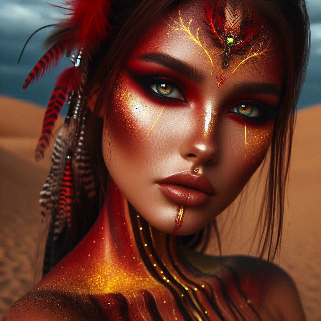 a girl with intricate tribal-inspired makeup showcases a blend of deep reds and bright yellows, accentuating her fierce expression. her sleek hair is adorned with feathers and beads, while delicate, glowing markings traverse her skin. the striking desert landscape in the background adds a mysterious and bold narrative to her portrayal.