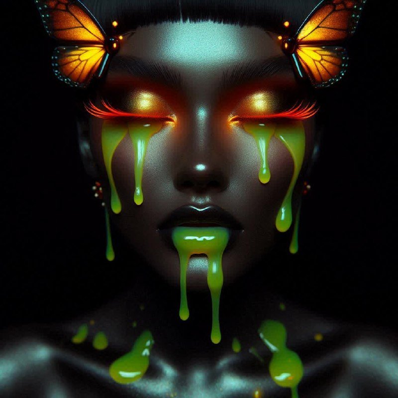 Завораживающий готический образ, где неземная красота сочетается с драматичным настроением. В центре внимания – лицо, окутанное таинственной атмосферой и подчеркнутое ярким макияжем. Большие светящиеся крылья бабочки парят над глазами, создавая впечатление эфемерности и легкости, контрастируя с насыщенностью образов. Выразительный оранжевый лайнер придает взгляду живость и энергию, а глубокий оттенок кожи деликатно подсвечен для создания четких контуров и выразительности черт лица. Неожиданный акцент – струящийся зеленый поток жидкости, словно символ мистической силы или преображения, добавляющий динамики и загадочности всему образу. Темный фон усиливает драматический эффект макияжа, фокусируя внимание на деталях и создавая ощущение погружения в волшебный мир готической эстетики. Этот образ – это не просто макияж, а настоящее произведение искусства, сочетающее в себе силу, элегантность и таинственность, воплощающее красоту сквозь призму готического стиля. Он привлекает внимание своей необычностью и вызывает бурю эмоций, оставляя неизгладимое впечатление. Это визуальная поэзия, где каждый элемент играет свою роль в создании неповторимого образа
