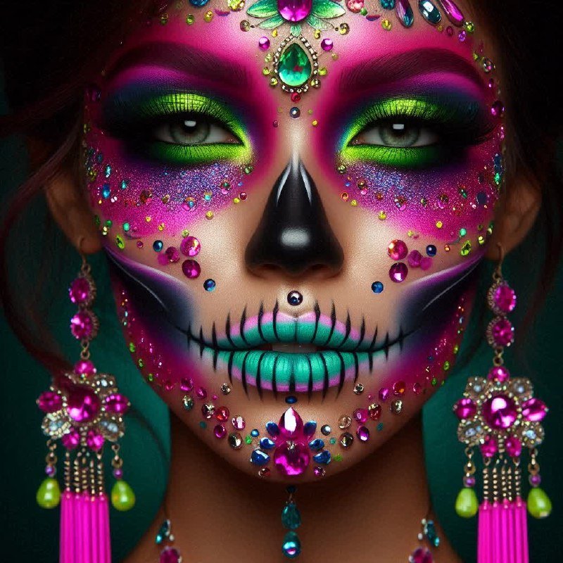 a girl showcases dramatic makeup with radiant magenta and luminous lime hues, complete with elaborate accessories. skull-like mouth features intricate details and sparkles, accented by large dangling earrings. she sports a neon green eye makeup with black eyeliner and bright cyan lipstick. the overall look is strikingly dynamic against a dark background.