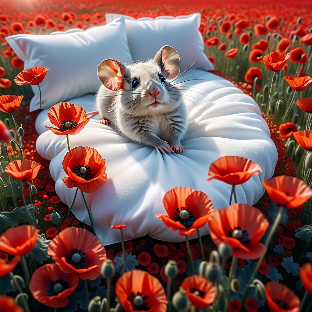 Завораживающий взгляд сверху на сказочную сцену: огромная двуспальная кровать утопает в буйстве цветущего макового поля. Мягкие и уютные простыни словно приглашают окунуться в мир сладких сновидений, где обитают милые мультяшные комочки и очаровательный мышонок Милот в гигантском подгузнике, чье пушистое хвостик игриво торчит вверх. Его бережно укрывает невесомое воздушное одеяло, создавая атмосферу невероятного комфорта и защищенности. Макросъемка раскрывает нежность лепестков маков, на которых сверкают капли росы, добавляя картине волшебства и реалистичности. Все это пронизано сюрреалистичными элементами и гиперсферическим стилем, создавая ощущение нереальности и захватывающей красоты. Изображение излучает ультра-милую атмосферу, погружая в мир безмятежности, фантазии и абсолютного очарования, где каждый элемент пропитан деталями и вниманием к мелочам, чтобы подарить зрителю незабываемые впечатления от созерцания этого удивительного уголка. Это визуальный гимн нежности, уюта и сказочной красоты, воплощенный в ярких красках и потрясающей детализации, способный тронуть сердца самых искушенных ценителей искусства