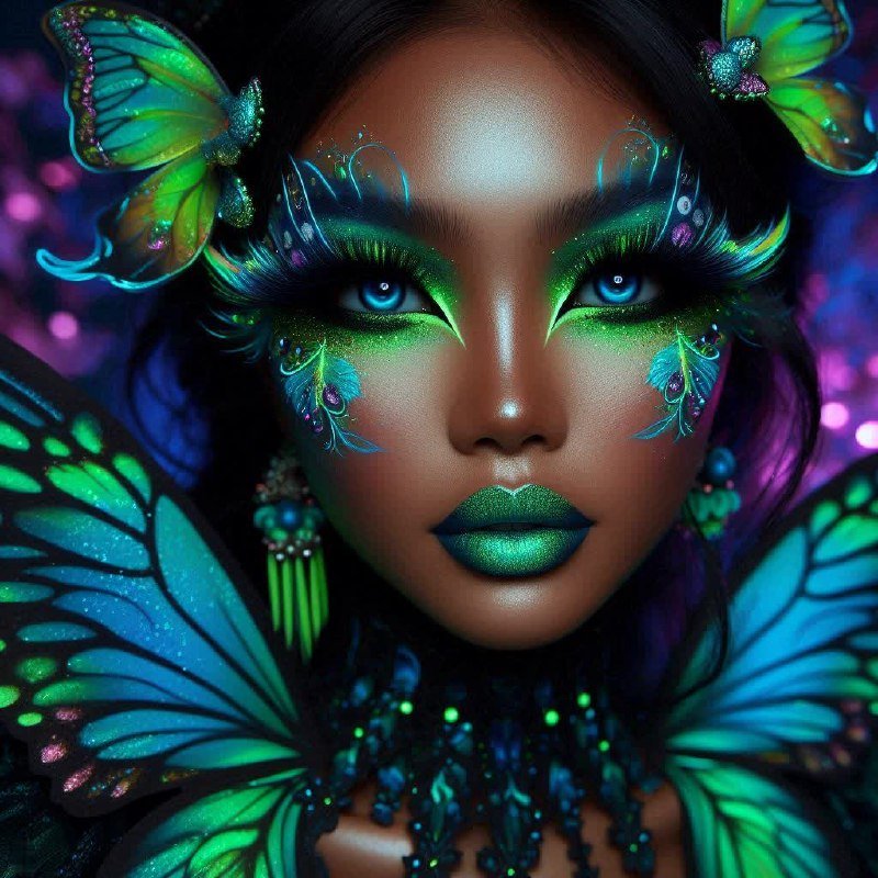 a girl showcases dramatic makeup with fluorescent green and electric blue hues, large expressive eyes framed by intricate butterfly wing designs that shimmer against her dark skin. bright teal accents are integrated into her outfit, while a surreal background enhances the magical vibe.