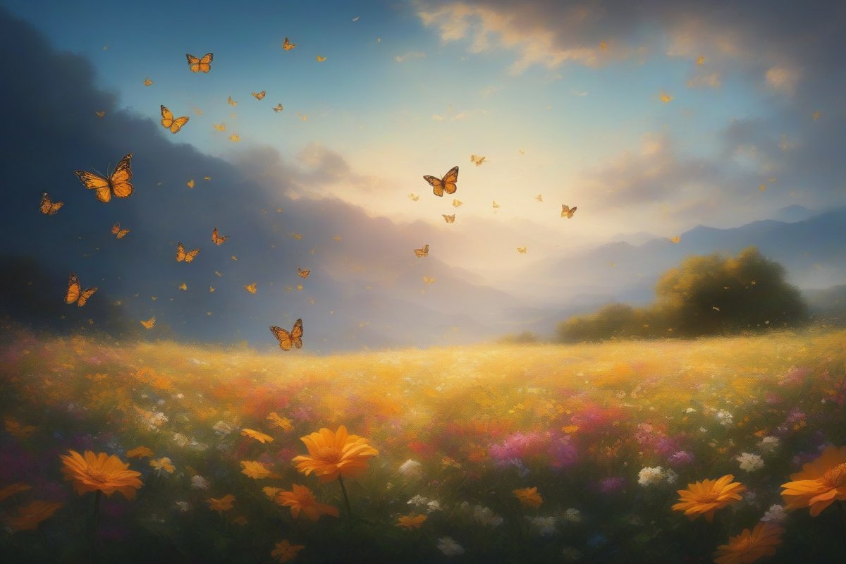 Завораживающее зрелище преображения природы запечатлено в этом изображении. На глазах распускаются цветы, окутывая объект и фон нежным цветочным великолепием, а лепестки мягко опадают в воздух создавая ощущение невесомости и волшебства. Игра света и тени скользит по поверхности, словно застывшие мгновения смены времен года – задержанная фотография четырех сезонов в одном кадре. Плавный переход от одного состояния к другому, выполненный в стиле иллюстрации, придает изображению особую эстетику и легкость. Все процессы происходят настолько естественно и бесшовно, что кажется это иллюзия, сотканная из света и цвета. Дополняет эту сказочную картину полет бабочек, добавляя образу живости и воздушности. Это не просто изображение – это поэма о красоте природы, воплощенная в художественной форме. Кажется, будто время замедлило свой ход, позволяя нам насладиться каждым мгновением этого чудесного преображения. Изображение излучает спокойствие и гармонию, приглашая зрителя погрузиться в мир фантазий и мечтаний, где возможно все. Здесь переплетаются реальность и вымысел, создавая неповторимую атмосферу волшебства и вдохновения