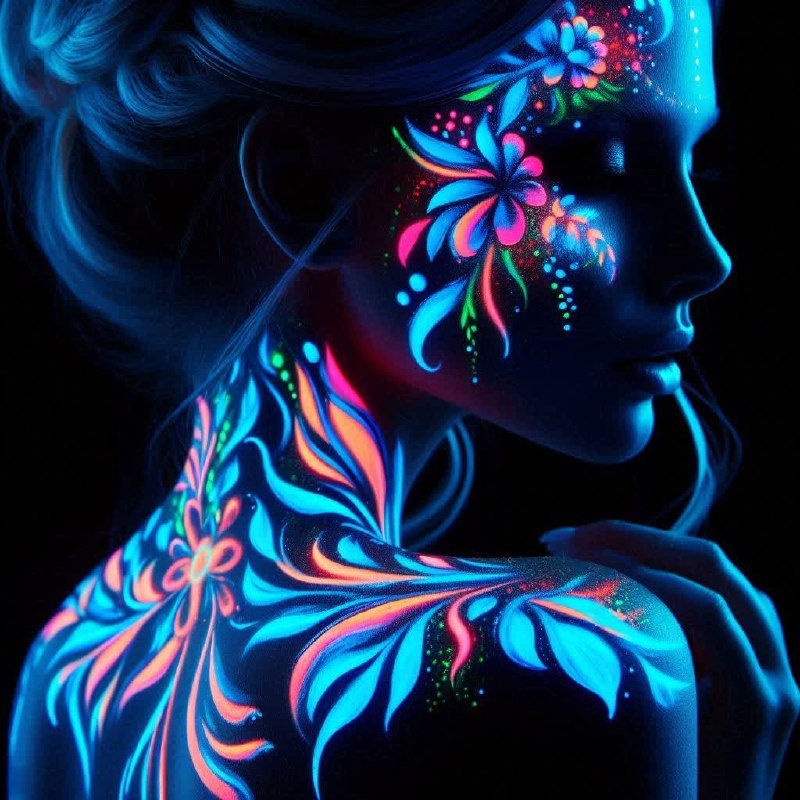 Завораживающая картина, сотканная из света и тени, где женский силуэт становится холстом для невероятного произведения искусства. Яркие неоновые татуировки, словно живые электрические потоки и мерцающий флуоресцентный крем, оживают на коже модели, создавая динамичный узор, полный энергии и загадочности. Стиль чароскиро придает композиции особую выразительность, подчеркивая контраст между светящимися элементами и глубоким темным фоном. Это не просто изображение – это визуальный гимн красоте и силе, сочетающий в себе элементы фантазии и футуризма. Каждая деталь продумана до мелочей: от плавных линий силуэта до насыщенности цветов татуировок. Зритель погружается в атмосферу волшебства и тайны, где реальность переплетается с мечтой. Взгляд невольно следует за танцем света, испытывая широкий спектр эмоций – от удивления и восхищения до легкой тревоги и предвкушения. Контраст между темным фоном и яркими акцентами создает эффект глубины и объема, делая изображение еще более привлекательным. Это произведение искусства притягивает внимание своей необычностью и оригинальностью, заставляя задуматься о границах красоты и самовыражения. В нем есть что-то завораживающее, гипнотическое – словно ты смотришь на ожившую легенду, рассказанную языком света и цвета. Это визуальное откровение, которое остается в памяти надолго после того, как вы отведете взгляд