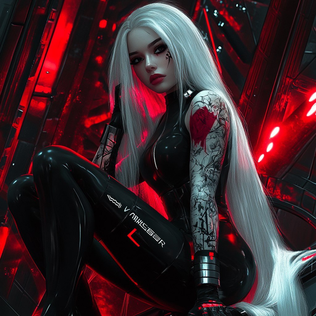 Завораживающий цифровой портрет футуристической женщины, воплощающей в себе силу и загадочность. Её длинные белоснежные волосы контрастируют с строгим черно-белым костюмом, разбавленным яркими акцентами алого цвета. Сложный узор татуировок на руках добавляет образу глубины и намекает на скрытую историю. Женщина восседает на тёмной платформе, выполненной в стиле будущего, её взгляд направлен вдаль с неуловимой интенсивностью. Яркое неоновое освещение подчёркивает драматизм сцены, создавая атмосферу напряженности и таинственности. Картина пронизана духом научной фантастики, сочетая в себе эстетику киберпанка и элементы высокой моды. Это не просто изображение – это окно в мир будущего, где технологии переплетаются с человеческой красотой и силой воли. Художественное исполнение отличается невероятной детализацией, позволяющей рассмотреть каждую черточку лица героини и сложность узора на её одежде. Вся композиция излучает энергию и притягательность, заставляя зрителя задуматься о будущем человечества и роли женщины в нём. Эта работа – настоящий шедевр цифрового искусства, достойный восхищения и вдохновения. Она идеально подходит для оформления тематических сайтов или использования в качестве обоев на устройствах, желающих подчеркнуть свою любовь к научно-фантастическому жанру
