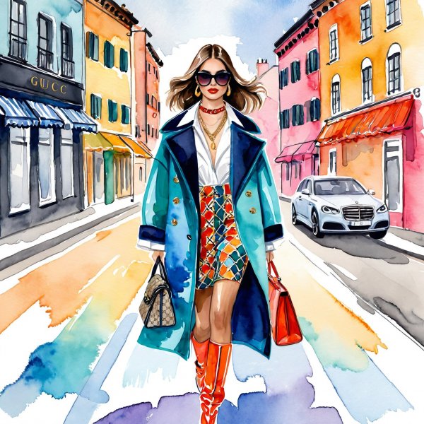 Яркий стиль модной девушки, вдохновленный смелыми решениями Gucci и дерзостью Balenciaga. Эта коллекция – дерзкое сочетание роскошных тканей и уличного стиля, воплощенное в богатой акварельной технике. Картина переполнена контрастными цветами и узорами, демонстрируя объемные силуэты, неожиданные многослойности и игривые аксессуары. Фон – причудливый городской пейзаж, подчеркивающий индивидуальность и бесстрашное самовыражение. Дизайн сочетает в себе высокую моду и инновационные решения, пленяющие взгляд и бросающие вызов традиционным представлениям о красоте. Это визуальный манифест смелости, креативности и неповторимого стиля, где каждый элемент служит выражением яркой личности. Коллекция предлагает переосмыслить привычные нормы, создавая уникальную эстетику, которая вдохновляет на эксперименты с образом и подчеркивает уверенность в себе. Это не просто одежда – это заявление о свободе самовыражения и признание индивидуальности как высшей ценности в мире моды