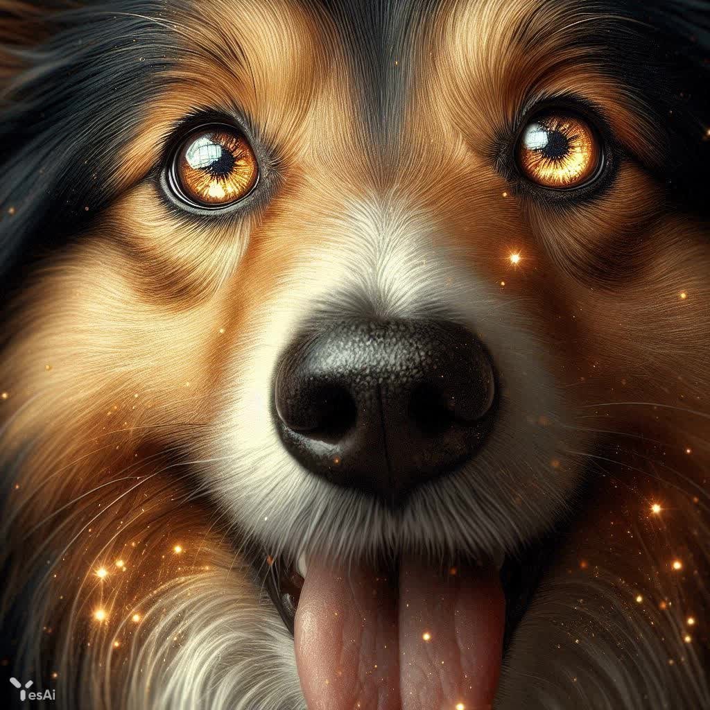 изображение в стиле гиперреализма, сосредоточившись на крупном плане морды собаки. Центрируйтесь на ее больших, сияющих глазах, наполненных выразительностью и живыми искрами света. Уделите особое внимание мега детализации и текстуре шерсти вокруг глаз и морды — каждая пышная ворсинка должна быть видна вплоть до мельчайших деталей.