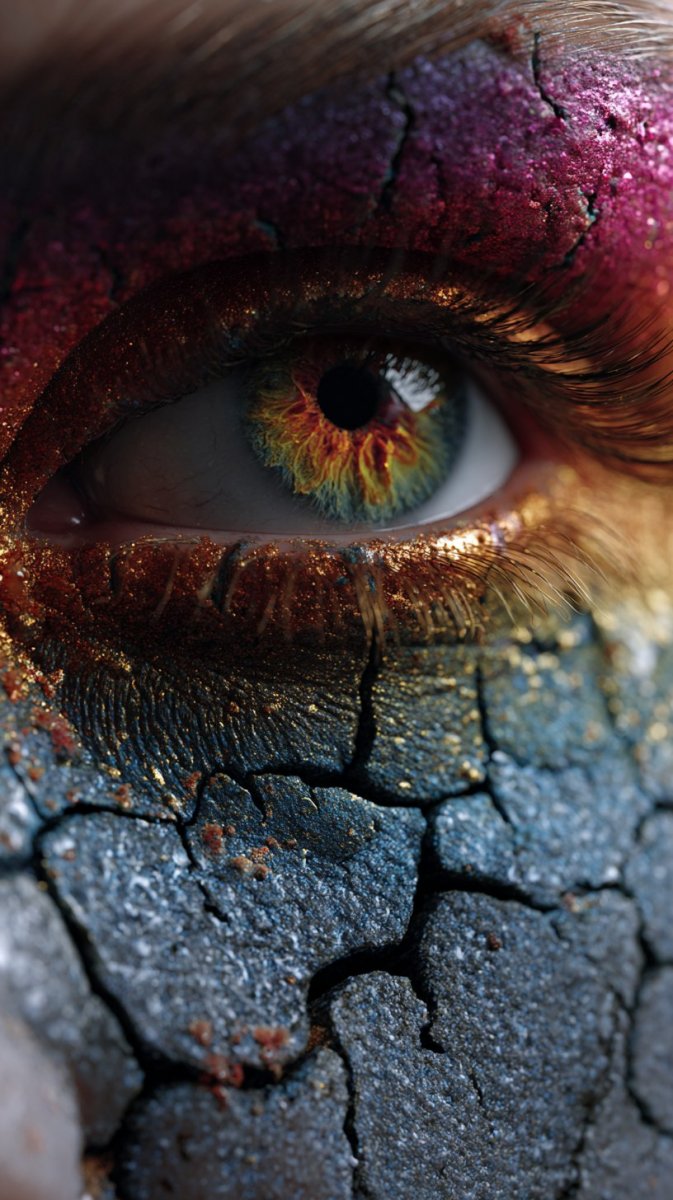 Завораживающий портрет девушки с кожей, напоминающей потрескавшуюся ландшафт земли и вулканической лавы, выполненный в стиле гиперреализма. Одна половина лица окрашена в яркий неоново-розовый цвет, а другая – в глубокий насыщенный голубой, создавая невероятный визуальный контраст. Главная особенность образа — это глаза, словно миниатюрные извержения вулканов, с радужкой, переливающейся огненными оттенками желтого, оранжевого, зеленого и красного. Длинные нарощенные ресницы подчеркивают взгляд, полный загадочности и силы. Яркие насыщенные цвета, драматичное освещение и элементы сюрреализма создают футуристическую атмосферу, делая этот образ по-настоящему уникальным и запоминающимся. Идеально подходит для использования в качестве обоев на телефон благодаря высокому качеству изображения и детальной проработке каждой детали. Этот портрет – это не просто изображение, это погружение в мир фантазий и необычных сочетаний красок, где природа и технологии сливаются воедино, создавая произведение искусства, которое захватывает дух своей красотой и оригинальностью. Изображение отражает смелое сочетание реализма и сюрреализма, предлагая зрителю взглянуть на привычные вещи под новым углом, открывая новые горизонты восприятия и вдохновляя на творчество