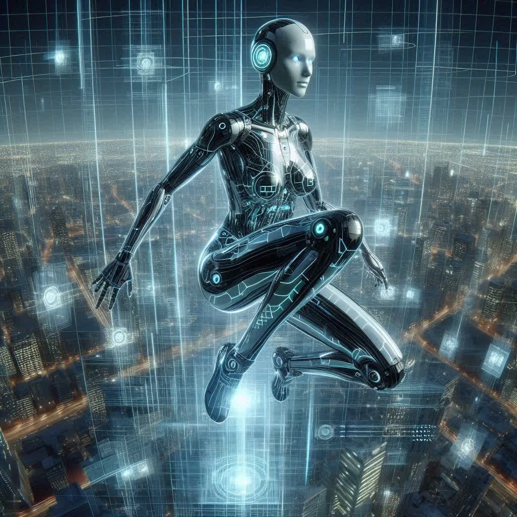 Изящный гуманоидный робот или цифровая аватар воплощает собой вершину технологического прогресса. Его корпус из хромированной и матово-черной стали украшен светящимися линиями, напоминающими электрические цепи, которые пульсируют потоками данных. Вместо одежды на нем проецируются геометрические фигуры из твердого света, создающие абстрактные узоры вокруг его центрального ядра. Множественные оптические сенсоры мягко светятся небесно-голубым цветом на лицевой панели, придавая ему загадочный и интеллектуальный вид. Робот динамично позирует на краю крыши, которая плавно переходит в мерцающую голографическую сетку, словно растворяясь в цифровом пространстве. Внизу простирается панорамный вид города, выполненный в стиле каркаса, над которым текут каскады светящегося цифрового кода. Эта футуристическая цифровая иллюстрация – не просто изображение, это окно в мир, где технологии и искусство сливаются воедино, создавая захватывающее зрелище, которое одновременно завораживает и вдохновляет на размышления о будущем человечества и его взаимоотношениях с искусственным интеллектом. Каждое детализированное элементом, от мерцающих светодиодов до сложных геометрических узоров, подчеркивает сложность и красоту этого технологического шедевра, демонстрируя безграничные возможности цифрового искусства и визуализации. Это пример того, как можно представить будущее в ярких и запоминающихся образах, сочетая реалистичность с фантазией и инновациями