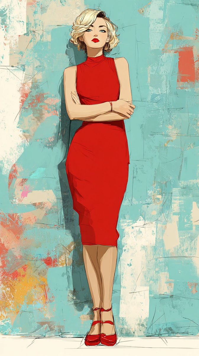 Элегантная и дерзкая иллюстрация демонстрирует смелый образ современной моды. В центре внимания – уверенная в себе модель с платиновыми волосами, воплощающая идеал стиля и харизмы. Она эффектно позирует на минималистичном белом фоне, подчеркивая безупречную фигуру в облегающем миди-платье. Яркий акцент образа создают обувь насыщенного красного цвета, гармонично сочетающаяся с сочными алыми губами модели. Добавление дерзких сетчатых колготок придает луку остроту и индивидуальность. Иллюстрация передает атмосферу авангарда и смелости, отражая последние тенденции в моде и искусстве. Это визуальная ода силе и уверенности, где каждая деталь тщательно продумана для создания запоминающегося и эффектного образа. Композиция отличается лаконичностью и выразительностью, что делает ее идеальной для модных журналов, рекламных кампаний или просто для тех, кто ценит смелый и стильный визуальный контент. Эта работа – не просто иллюстрация, а заявление о себе, отражение неповторимого вкуса и стремления к совершенству в мире моды. Образ модели излучает энергию и уверенность, вдохновляя на эксперименты со стилем и самовыражением