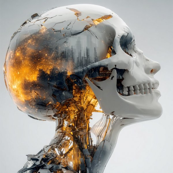 Завораживающий гиперреалистичный портрет кибернетической головы, воплощающий симбиоз органики и технологий. В центре внимания – лицо с безупречно гладкой кожей, оживленное яркими световыми эффектами и мягкой улыбкой, создающей ощущение спокойствия и уверенности. Голову украшает футуристичный шлем неоново-оранжевого цвета, подчеркивающий ее кибернетическую природу. За головой разворачивается эпическое зрелище – бушующее вулканическое извержение, окутанное клубящимися облаками, добавляя драматизма и масштабности композиции. Изображение выполнено в уникальном стиле Дэниела Саймона, характеризующемся глубоким рельефом текстур и невероятной детализацией, что создает ощущение трехмерности и реалистичности. Прическа – низкий пучок, плотно зафиксированный у шеи, добавляет образу элегантности и сдержанности, контрастируя с футуристическим окружением. Высокий контраст подчеркивает четкость линий и глубину теней, а использование камеры Sony Alpha 1 и объектива FE 85mm f1.4 GM обеспечивает исключительное качество изображения и реалистичную передачу деталей. Кажется, будто смотришь на живого человека из будущего, чья судьба неразрывно связана с технологиями и стихийными силами природы. Это произведение искусства заставляет задуматься о границах между человеческим и машинным, органическим и искусственным, красотой и разрушением. Изображение обладает мощной визуальной привлекательностью и вызывает глубокие эмоциональные отклики