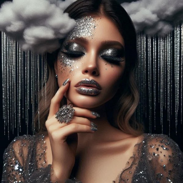 Завораживающий портрет молодой женщины в соблазнительном платье без бретелек, где блеск и мистическая красота сливаются воедино. Ее лицо украшено сверкающим глиттером, создавая эффект неземной сияющей кожи, а на изящном пальце красуется крупное кольцо, намекающее на тайну и загадочность. За ней простирается фантастический облачный фон, сотканный из множества ниспадающих прядей, напоминающий сказочное полотно или видение из другого мира. Выразительный макияж глаз с использованием серебристого глиттера подчеркивает глубину взгляда и добавляет драматизма образу, а блестящие серебряные ногти завершают этот тщательно продуманный образ роскоши и гламура. Темный фон усиливает контраст и фокусирует внимание на главной героине, делая ее центром внимания в этом визуально впечатляющем кадре. Фотография выполнена с использованием профессионального оборудования Fujifilm X-T4 и объектива 23mm f/2, что обеспечивает четкость деталей и красивое размытие фона, создавая эффект кинематографичности и подчеркивая художественную ценность работы. Это не просто портрет, а настоящая поэзия в движении, запечатленная на пленке, полная таинственности и очарования. Кажется, будто она сошла со страниц волшебной сказки или явилась из мира грез, оставив после себя лишь шлейф блесток и загадок. Идеальный образ для тех, кто ценит красоту в ее самых смелых и неординарных проявлениях