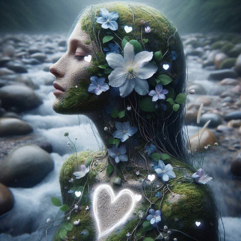 dalle Женщина из камней и мха: цифровое спокойствие в природном потоке. Картинка из нейросети Далли 3