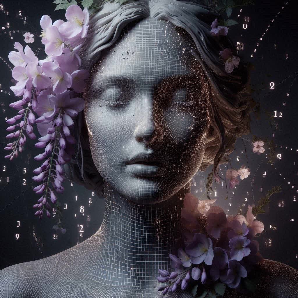 Завораживающая статуя в образе нежной женщины предстает перед зрителем в сюрреалистическом мраке. Ее кожа покрыта сложным узором из текстовых символов, создавая ощущение загадочности и связи с неведомым знанием. Поверхность скульптуры пронизана перфорированным сетчатым рисунком, а светящиеся трещины добавляют мистический оттенок, словно раскрывая внутреннюю энергию произведения. Мягкий преломленный свет подчеркивает плавные линии фигуры, создавая игру теней и бликов. В основе композиции лежит безупречная естественная симметрия, усиливающая ощущение гармонии и красоты. Вокруг статуи расползлись струящиеся лавандовые соцветия глицинии и цветущий клематис, добавляя природной свежести и романтики. На скульптуре сверкают хрустальные капли, словно слезы или роса, а замысловатые узоры точно повторяют контуры тела, подчеркивая его изящество. Мягкий мох, покрывающий основание статуи, создает ощущение единения с природой и придает композиции глубину. Фотореалистичность изображения достигнута благодаря профессиональной фотосъемке и использованию техники двойной экспозиции, которая позволяет объединить несколько изображений в одно, создавая уникальный визуальный эффект. Вся работа пронизана атмосферой неземной красоты и таинственности, приглашая зрителя задуматься о природе бытия и скрытых смыслах. Это произведение искусства – воплощение утонченности, загадки и гармонии между человеком и природой, между материальным и духовным миром