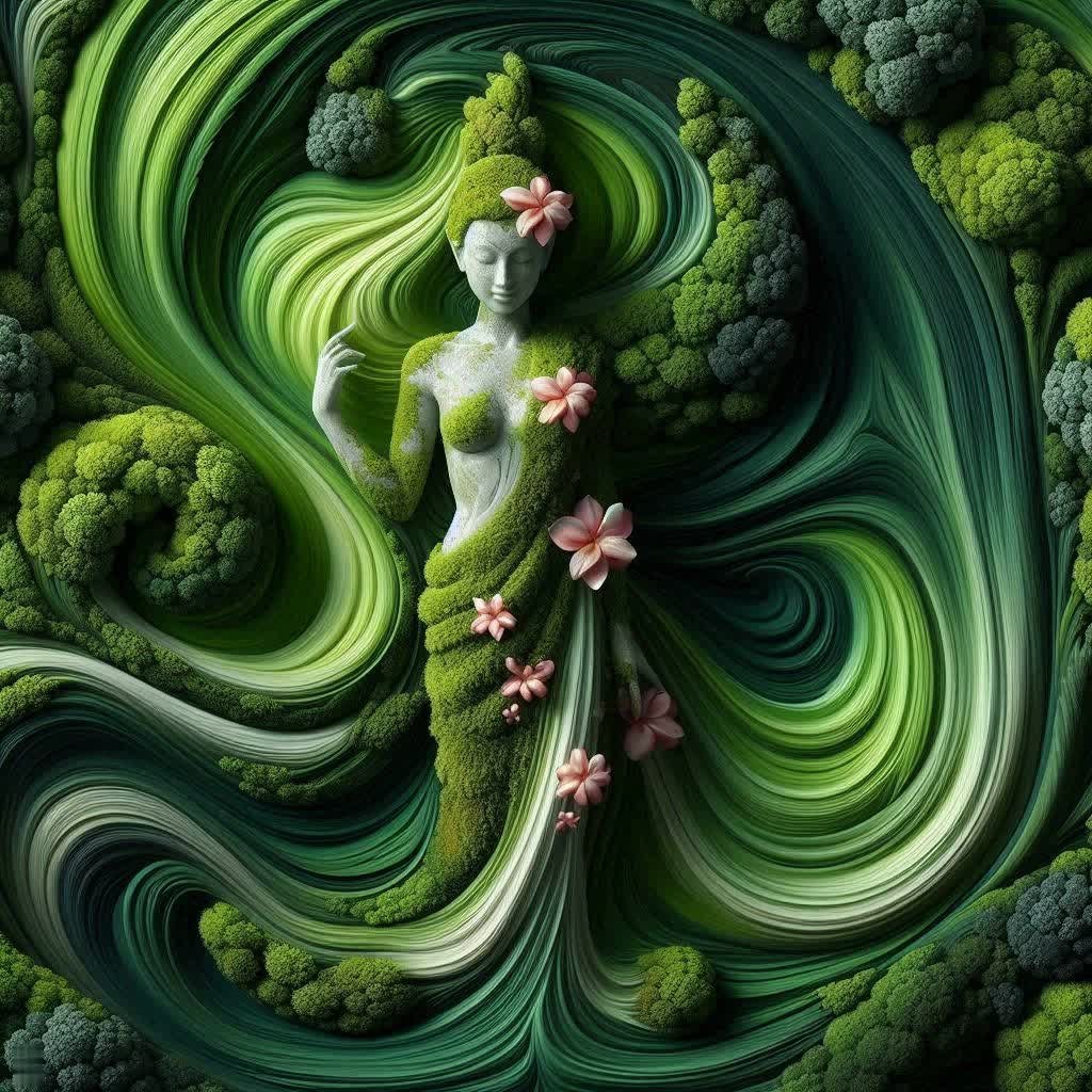 statue, moss flowing shape in the stream, blooming flowers on dress, glossy green leaves, sleek posture, patterns following body contours, female figure floral fissures, reflective beads, zen atmosphere, organic curves, earthy palette, vibrant and mystical bg, photorealistic professional photo double exposure