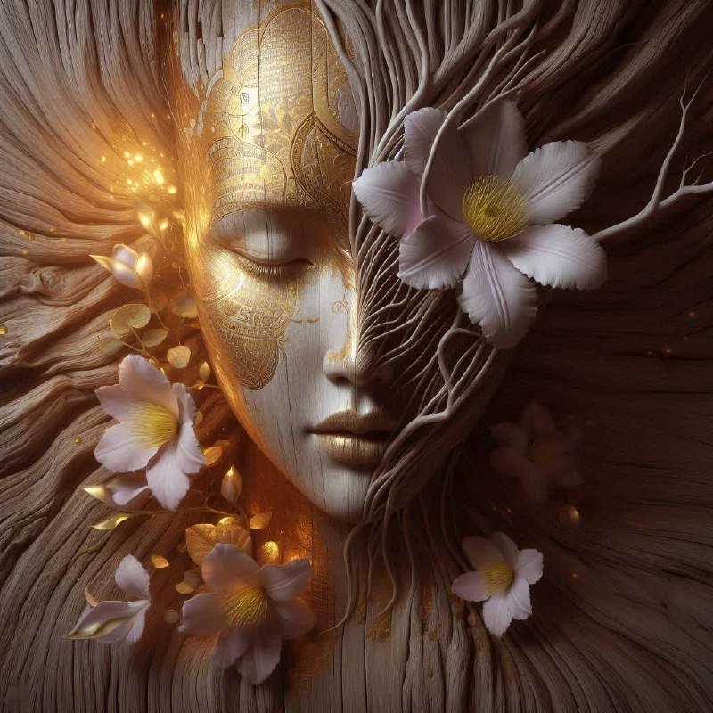 Завораживающая скульптурная композиция, где нежная женская красота переплетается с природными элементами и мистическими знаками. Лицо, будто сотканное из света и тени, частично скрыто текстурой дерева, создавая ощущение загадочности и утонченности. Изящные побеги клематиса обвивают скульптуру, символизируя жизненную силу и обновление, а распускающиеся цветы добавляют образу нежности и хрупкости. Поверх кожи словно нанесены древние письмена и таинственные символы, намекая на глубокую связь с мудростью веков и скрытыми знаниями. Из головы произрастают ветви дерева – метафора внутренней гармонии и единения человека с природой, отражающая его духовную сущность и потенциал роста. Мягкий рассеянный свет подчеркивает объем и детали скульптуры, создавая ощущение волшебства и нереальности. Это произведение искусства воплощает собой красоту, тайну и глубокую связь между миром человека и окружающим пространством, приглашая зрителя к размышлениям о вечных вопросах бытия и поисках истины. Вся композиция дышит спокойствием и умиротворением, предлагая созерцать не только внешнюю красоту, но и внутренний мир, полный тайн и загадок. Использование золотых элементов придает работе ощущение роскоши и божественного сияния