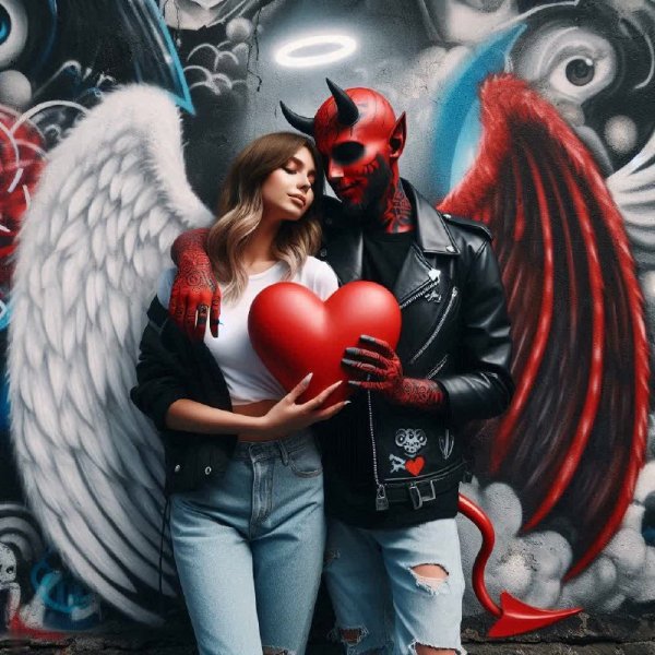 Завораживающая встреча света и тьмы в глубине таинственного леса. Эта невероятно трогательная фотография запечатлевает момент единения двух противоположностей – нежной ангельской девушки с сияющими крыльями и дерзкого демонического мальчика с рогами. Их руки сплетаются в форме сердца, символизируя хрупкую надежду на гармонию среди мрака и колдовства. Атмосфера окутана мягким, волшебным светом, который подчеркивает сюрреалистичность происходящего. Использование двойной экспозиции добавляет изображению глубины и загадочности, создавая ощущение параллельных миров, переплетающихся друг с другом. Фотография выполнена в фотореалистичной манере, демонстрируя высокий профессионализм автора и внимание к деталям. Общее настроение снимка – очаровательное и немного грустное, вызывающее одновременно восхищение и легкую тревогу. Это история о любви, преодолевающей границы добра и зла, воплощенная в завораживающем визуальном образе. Кажется, будто ты заглянул в сказочную страну, где возможно все – даже союз ангела и демона, объединенных искренними чувствами. Невероятное сочетание мифологических персонажей и художественных приемов делает эту фотографию по-настоящему уникальной и запоминающейся, вызывая бурю эмоций и заставляя задуматься о вечных вопросах любви, света и тьмы