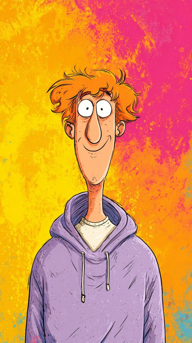Яркий мультяшный персонаж в стиле наивного искусства поражает своей экспрессией и гротескными чертами. Мягкие пастельные тона фона контрастируют с насыщенностью красок, создавая ощущение радостного удивления. Персонаж одет в светлый лиловый худи и простую белую футболку, что подчеркивает его непринужденность и беззаботность. Большой нос и гипертрофированные черты лица добавляют персонажу комичности и уникальности. Красные косы и растрепанные пряди розовых волос завершают образ, придавая ему игривости и динамизма. Вся композиция излучает позитив и энергию благодаря сочетанию ярких цветов – желтого, оранжевого и розового – которые гармонично переплетаются друг с другом. Это визуально привлекательный персонаж, созданный в простой манере, но обладающий запоминающимся характером и выразительностью. Он словно ожившая иллюстрация из детской книжки, наполненная юмором и непосредственностью. Карикатурные выражения лица усиливают эффект комичности и делают его мгновенно узнаваемым. Общее впечатление – это жизнерадостный и немного безумный персонаж, который не оставляет равнодушным