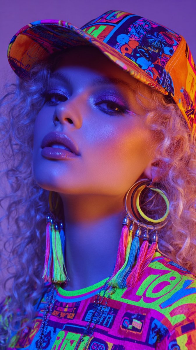 a photo of an attractive blonde woman with big curly hair, fluorescent neon makeup, colorful tassel earrings, vibrant baseball cap adorned with patterns and motifs, psychedelic dreamy vibe, illustration, kokeshi style, intense outfit, serene backdrop, matte eyeliner #role_neon_model_2