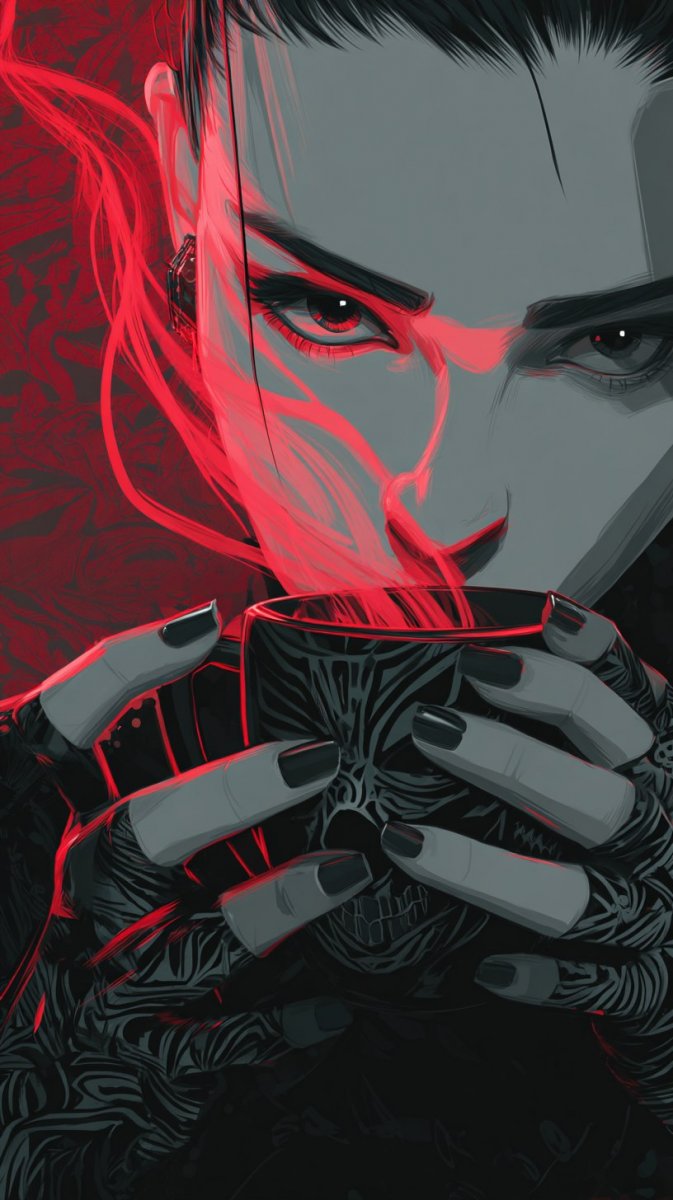 Загадочное изображение сочетает в себе элементы сюрреализма и готики создавая атмосферу таинственности и притягательности. Чёрная чашка, контрастно выделяющаяся на тёмном фоне, становится центром внимания благодаря ярко-красной помаде, словно символ страсти и соблазна. Женская рука в длинных перчатках изящно удерживает чашку добавляя сцене нотку элегантности и загадочности. Цифровой стиль исполнения подчёркивает современность изображения при этом детализация поражает воображение – каждый элемент проработан с невероятной точностью. Красный дым, окутывающий губы словно живое существо, придаёт композиции динамизм и мистическую глубину. Сквозь клубящийся дым проглядывает изображение черепа намекая на бренность бытия и неизбежность судьбы. Тонкий узор зебры премин, едва заметный на коже, добавляет изображению неожиданную текстуру и визуальный интерес. Высокое разрешение и чёткая фокусировка позволяют рассмотреть мельчайшие детали создавая эффект полного погружения в сюрреалистический мир. Это не просто изображение – это визуальная поэзия, наполненная символами и метафорами, вызывающая бурю эмоций и заставляющая задуматься о вечных вопросах жизни и смерти красоты и увядания страсти и отчаяния. Картина завораживает своей мрачной красотой и приглашает зрителя в мир фантазий и грёз где реальность переплетается с вымыслом а обыденное становится необыкновенным