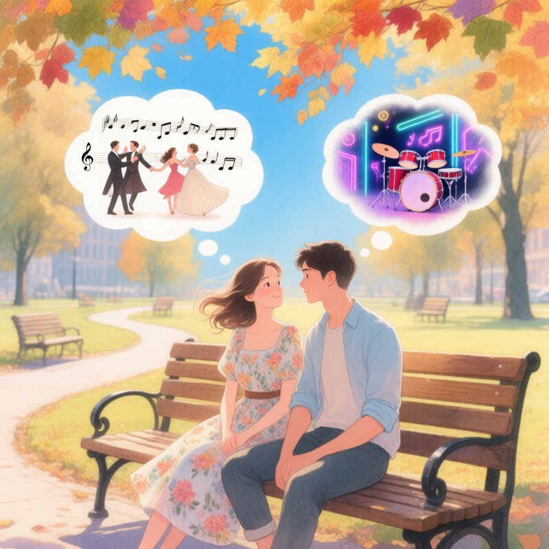 Идиллическая осенняя сцена в городском парке, пронизанная мягким золотым светом заката. Молодая женщина в легком платье и мужчина в повседневной одежде уютно расположились на деревянной скамейке под сенью разноцветных листьев, создавая атмосферу покоя и тепла. Небо, окрашенное нежными оттенками голубого, проглядывает сквозь кроны деревьев, добавляя картине воздушности и легкости. Встревоженные мысли каждого из них визуализированы в виде мечтательных облачков над головами. У женщины – элегантные ноты классической музыки и образы роскошного бального зала, где пары грациозно танцуют вальс, словно приглашая окунуться в мир романтики и изящества. Над мужчиной же парят современные музыкальные знаки и яркие картины динамичной дискотеки с неоновым светом, мерцающими огнями и энергичными ритмами ударных инструментов, символизирующие любовь к современному искусству и бурной жизни. Фоном служит мягко размытый пейзаж парка, подчеркивающий интимность момента между влюбленными. Картина выполнена в нежной пастельной гамме с элементами акварели, создавая ощущение легкости и воздушности, а также передавая всю красоту осенней природы и утонченную атмосферу любви и мечтаний. Это зарисовка о двух людях, чьи внутренние миры наполнены разными мелодиями, но их сердца бьются в унисон под шепот падающих листьев