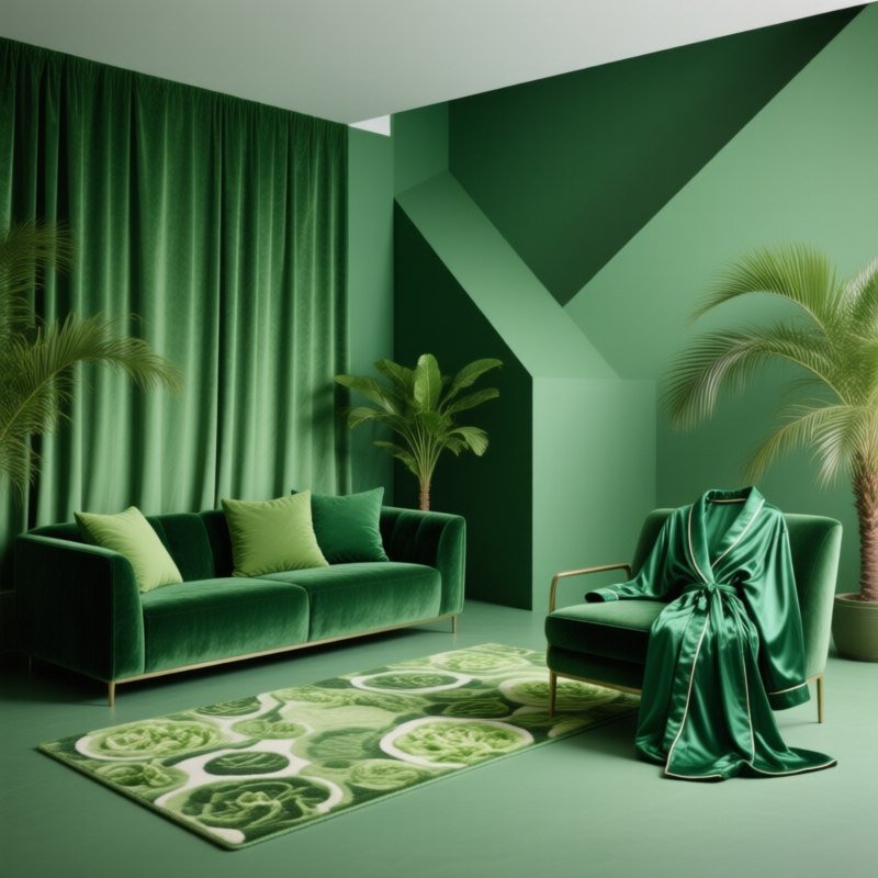 Изысканный интерьер в изумрудных тонах создает атмосферу уюта и роскоши. Стены, украшенные мягкой зеленой тканью, словно окутывают теплом, а стильный велюровый диван приглашает расслабиться в окружении подушек различных оттенков зеленого – от нежного мятного до насыщенного малахитового. Зелень природы проникает в пространство благодаря живым растениям и стройным пальмам, наполняя воздух свежестью и жизнью. Легкая зеленая шелковая халат, брошенная на стул, добавляет нотку непринужденной элегантности, а ковер с изображением салата на полу завершает этот гармоничный ансамбль. Все детали интерьера выдержаны в единой цветовой гамме, создавая ощущение спокойствия и умиротворения. Это оазис зелени и комфорта, где каждая деталь продумана до мелочей для максимального удовольствия от пребывания. Здесь можно забыть о суете внешнего мира и насладиться моментом тишины и релаксации в окружении приятных текстур и природных оттенков. Интерьер излучает спокойствие и благородство, располагая к отдыху и вдохновению. Это идеальное место для тех, кто ценит красоту и комфорт в каждой детали своего дома. Зеленый цвет символизирует гармонию с природой, рост и обновление, что делает этот интерьер особенно привлекательным для людей, стремящихся к позитивным эмоциям и духовному равновесию