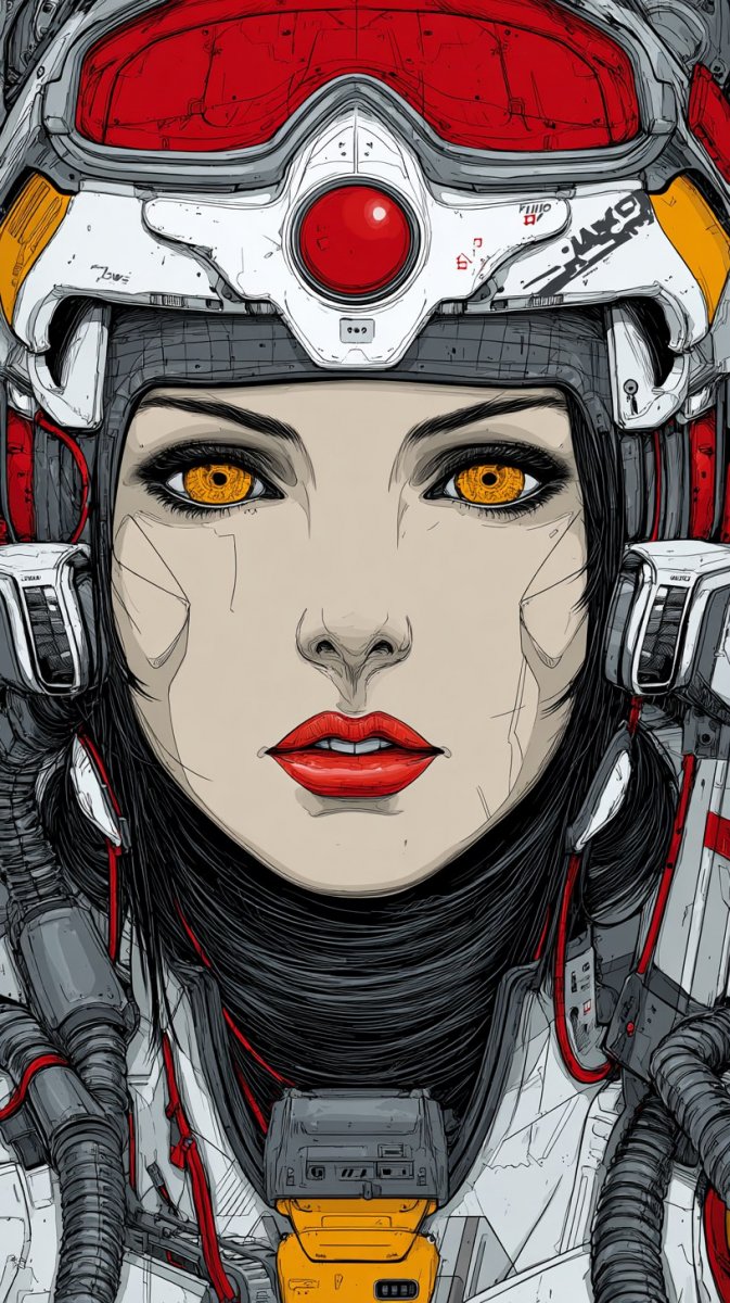 ink drawing, illustration futuristic woman’s face, close-up, dark hair, white helmet red black accents, electronic components, sensors, large red eyes, sharp nose, slгightly open mouth, blurred futuristic ambiance, metallic sheen intricate patterns, sleek updo serious expression, piercing yellow eyes, intense mood, vast desert landscape #ROLE_CYBORG