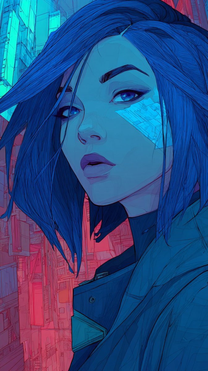 ink drawing, illustration young woman blue hair styled futuristic outfit, serious expression looking directly camera, face painted blue white design resembling cityscape, geometric shapes lines, large red light metallic material, blurred city street night buildings lights, ominous foreboding #ROLE_CYBORG