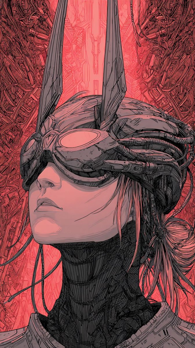 Завораживающий цифровой портрет женщины в футуристическом шлеме с острыми рогами – воплощение силы и загадочности. Инкрустированный металлическими деталями шлем серебристого цвета обхватывает голову и шею, словно часть тела, а сложные узоры и переплетающиеся провода создают ощущение технологической мощи и кибернетического совершенства. Цветовая гамма – глубокий черный и насыщенный красный – подчеркивает мрачную атмосферу и внушает трепет. Небрежный пучок с хвостиком добавляет образу бунтарский оттенок, контрастируя с холодным блеском металла. Острые рога, словно символ власти и доминирования, возвышаются над шлемом, придавая рисунку драматизм и остроту. Вся композиция пронизана ощущением опасности и непредсказуемости, намекая на скрытую силу и могущество персонажа. Это изображение – не просто портрет, а визуальная метафора о слиянии человеческой природы и передовых технологий, о трансформации и преодолении границ возможного. Идеально передает концепцию кибернетического существа, сочетающего в себе органическое и механическое, живое и искусственное. Работа излучает энергию и вызывает желание узнать историю этой загадочной женщины-киборга