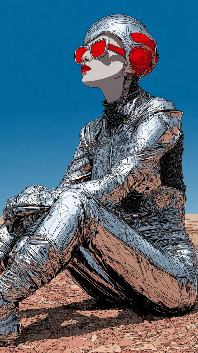 ink drawing, illustration woman sitting ground desert-like environment wearing shiny silver metal suit red helmet head metallic sheen hands resting knees looking into distance blue sky barren ground no other people or buildings background, intricate patterns and designs, sinister expression, deep red lips, intense futuristic mood, black frame sunglasses, sleek updo hairstyle #ROLE_CYBORG