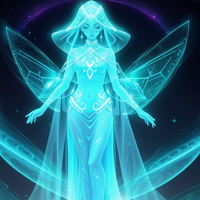 Elegant woman, ethereal beauty, translucent aura, shimmering skin, otherworldly grace, bioluminescent patterns, crystalline jewelry, floating nebula background, alien flora glowing softly, ancient glyphs carved in stone pillars, holographic projections of distant galaxies, digital painting, soft focus, dreamlike quality, iridescent colors - Art, CGI, 1024K