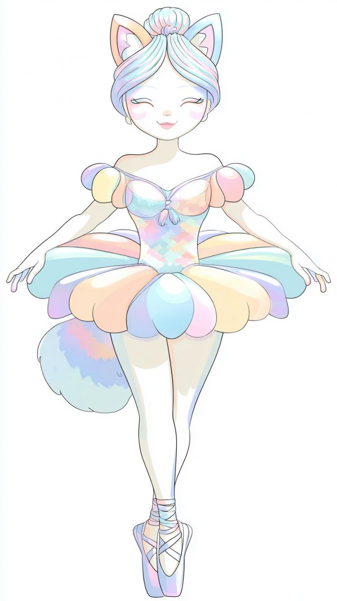 Изящная балерина в милом стиле, выполненная в технике плоских цветных блоков. Изображение отличается высоким уровнем детализации и отсутствием контуров или теней, что создает ощущение легкости и воздушности. Девушка одета в полосатый свитер нежно-розового и бежевого цветов, радостно улыбаясь в камеру. Пушистый хвост добавляет образу игривости и очарования. Яркие цвета и привлекательное личико подчеркивают ее беззаботность и обаяние. Фон вокруг рисунка выполнен в виде чистого белого пространства, что позволяет акцентировать внимание на фигуре балерины. В целом, это милое и запоминающееся изображение, идеально подходящее для использования в различных проектах, где требуется добавить нотку нежности и очарования. Светлая палитра с преобладанием пастельных тонов создает ощущение уюта и тепла, а яркие акценты делают рисунок визуально привлекательным. Детализированная проработка элементов подчеркивает мастерство художника и добавляет изображению реалистичности. Этот клипарт станет прекрасным украшением для детских товаров, открыток, приглашений и других материалов, где важен позитивный и доброжелательный настрой. Обаятельные глаза балерины словно притягивают внимание зрителя, вызывая улыбку и чувство радости