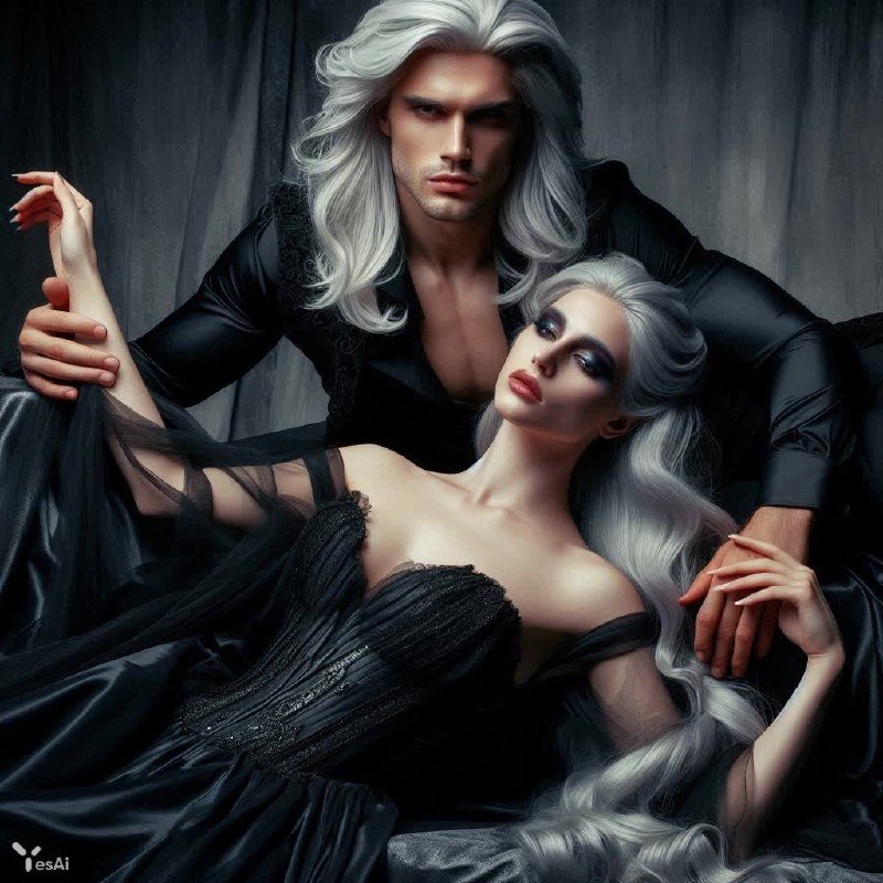 Завораживающая сцена из мира фэнтези, где переплетаются страх и влечение. Молодая женщина в роскошном черном кружевном халате покоится у ног статного мужчины с бледной кожей и длинными белыми волосами. Его открытая рубашка обнажает мускулистое тело, а самоуверенный взгляд и прикосновение к ней создают атмосферу напряженного ожидания. Их взгляды полны страсти, словно обращены прямо к зрителю, вовлекая его в этот интимный момент. Задний план погружает в готическую обстановку с мерцающими свечами и динамичной сценической постановкой. Яркое освещение, пронизанное магическим сиянием, подчеркивает фантастические мотивы картины. Сочетание ярких цветов – глубокого черного, серебристого и алого – создает насыщенный визуальный эффект. Общая атмосфера пропитана романтикой и напряжением, заставляя зрителя чувствовать себя участником происходящего. Гиперреалистичная детализация изображения, выполненная в полный рост с соотношением сторон 1:2, придает сцене невероятную живость и убедительность, словно оживляя героев и перенося нас в мир волшебства и тайн. Картина дышит силой чувств и загадочностью, оставляя неизгладимое впечатление. Это история о власти, искушении и запретной любви, рассказанная языком визуального искусства