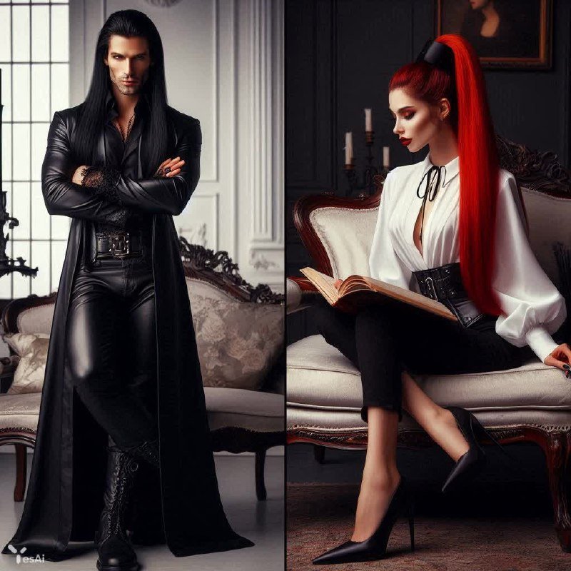 Fantasy. A handsome pale aristocrat with very long black hair, dressed all in black, looking like a Dark Lord, stands with his arms crossed over his chest and stares at the woman. A beautiful slender woman of 25-30 years old with neon red long hair gathered in a high ponytail, wearing a white light blouse with a wide black belt, black trousers and stilettos, gracefully crossing her legs, sits on an antique sofa and flips through a magazine. Her gaze is playful, his is dark and domineering, both looking at the viewer. Background: a luxurious living room in an expensive salon with velvet curtains and antique furniture, cinematic lighting, brigh...